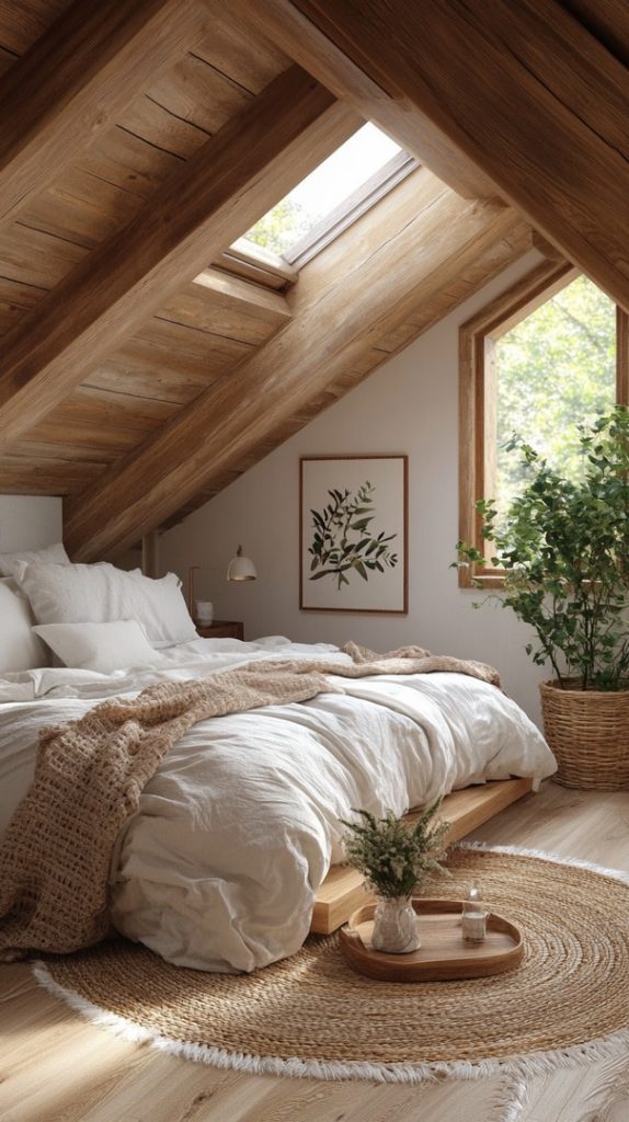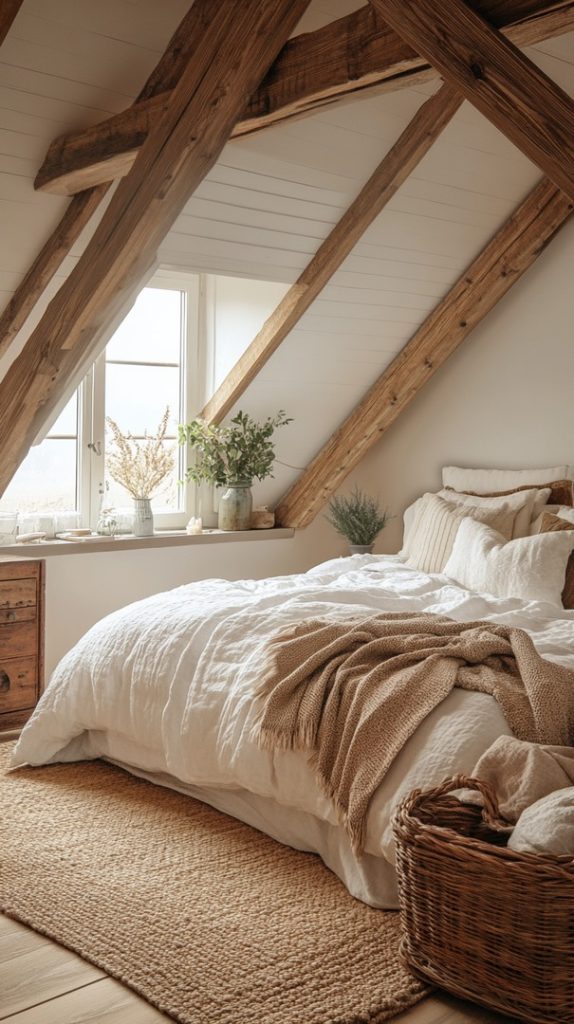 This design balances the rustic charm of exposed wood beams with modern bedding and furnishings. The minimalist approach allows the natural textures to shine.