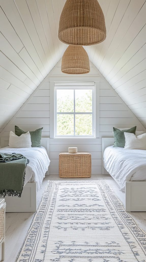 A bright attic space with soft bedding and a large window makes this room feel airy and open. The addition of a woven ottoman adds a natural touch to the décor.