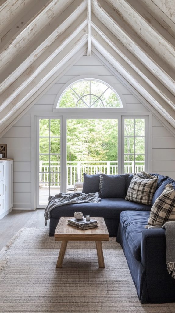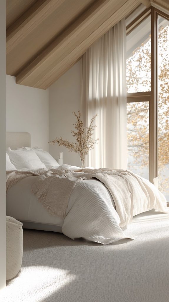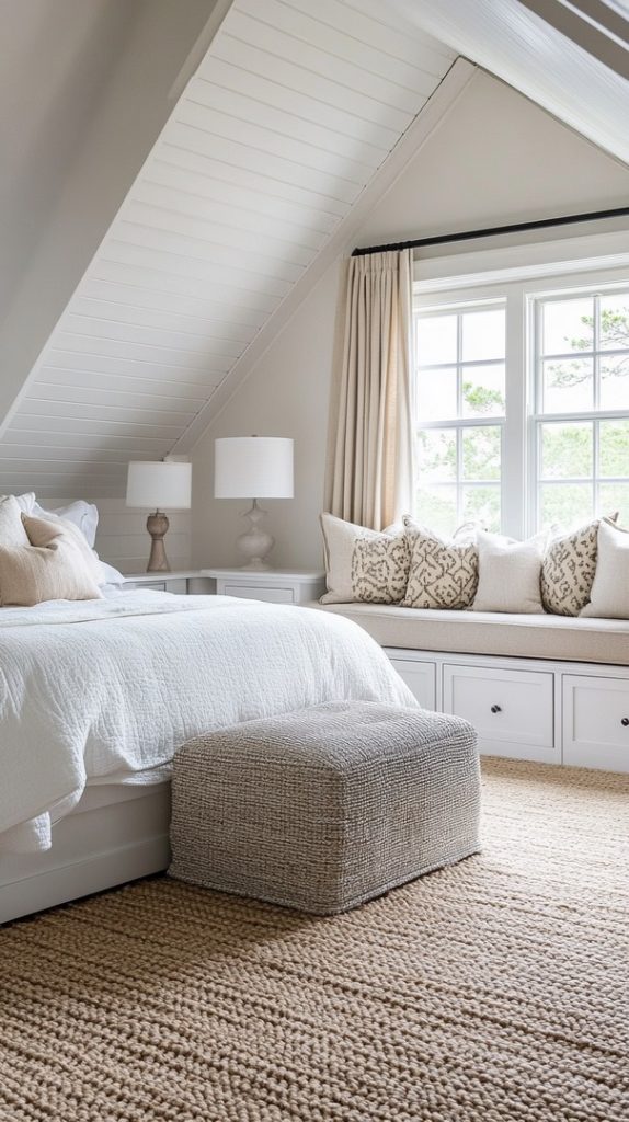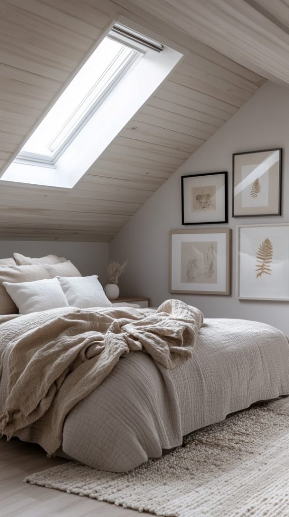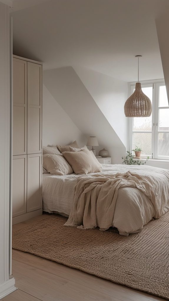 With light gray and beige tones, this attic bedroom feels soft and serene. The large window adds natural light, making it a perfect space for unwinding.