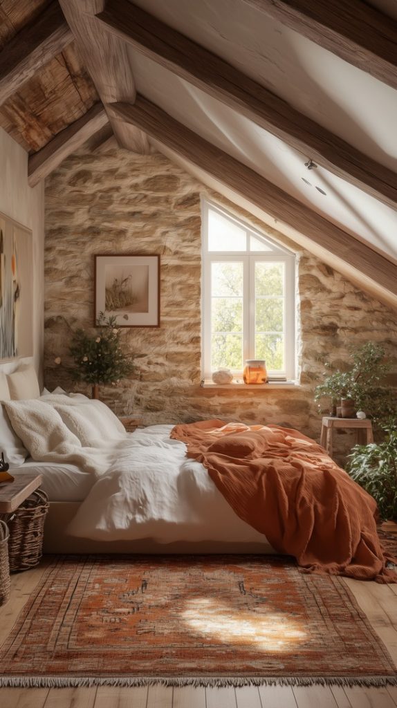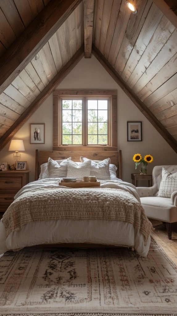 A cozy bed beneath the slanted roof, paired with rustic wooden beams, gives this attic bedroom a simple yet comforting ambiance.