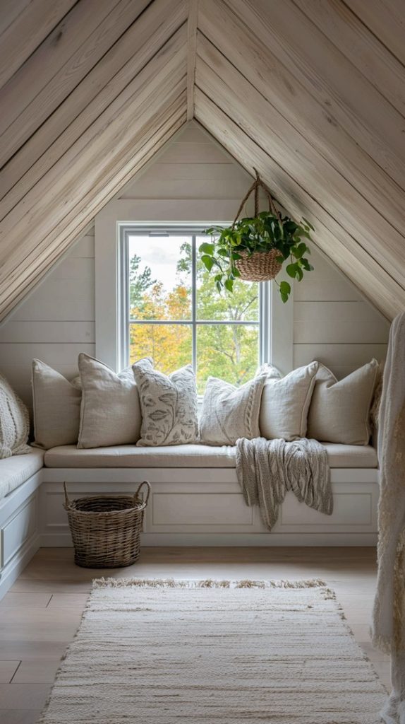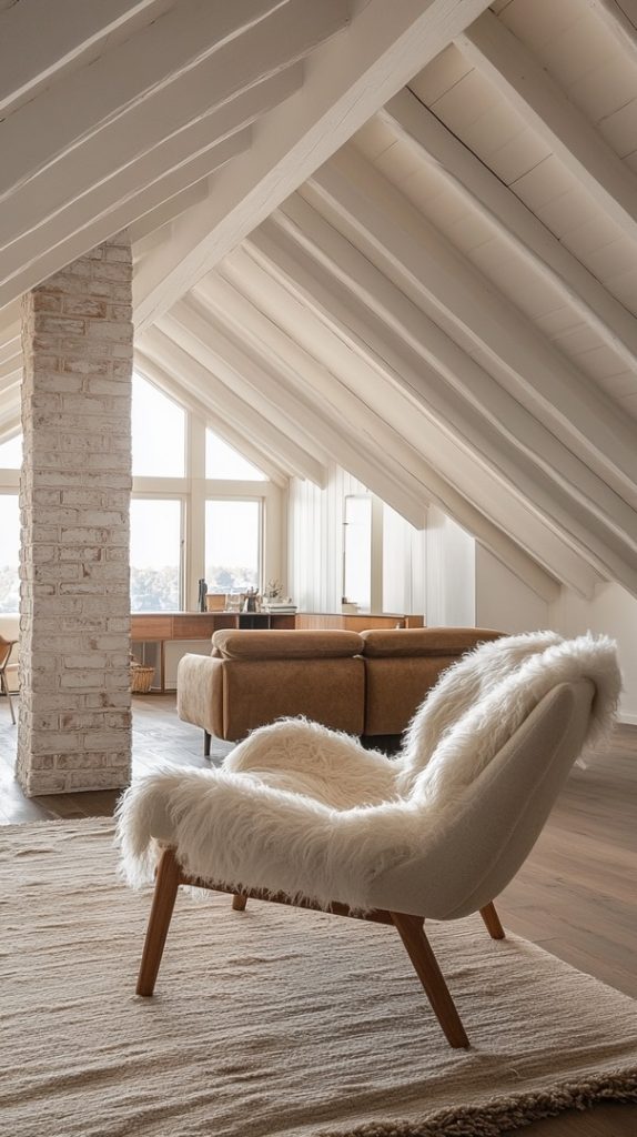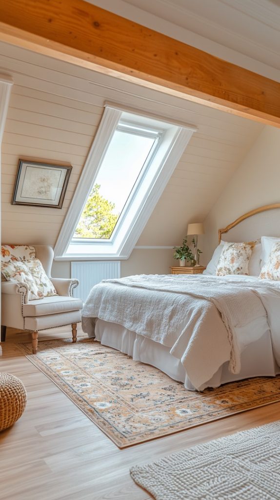 This attic has a vintage feel, with soft neutral furniture and a cozy armchair. It’s a perfect space for quiet relaxation or reading.