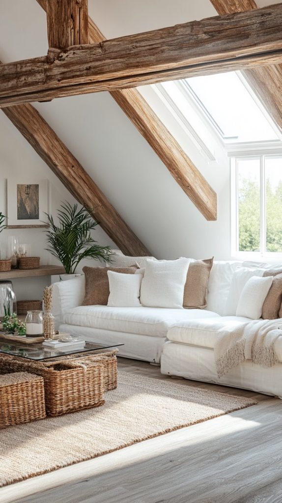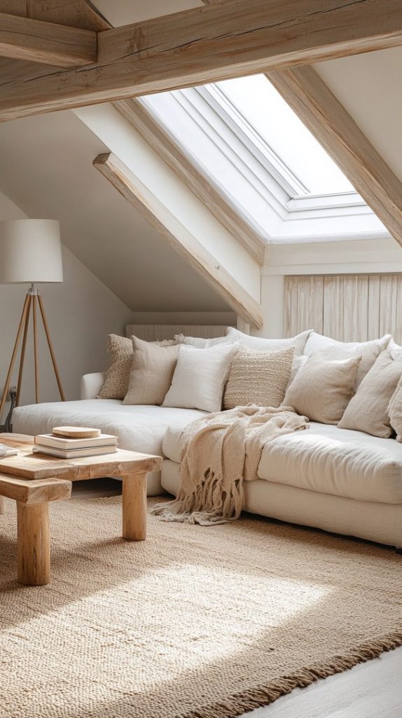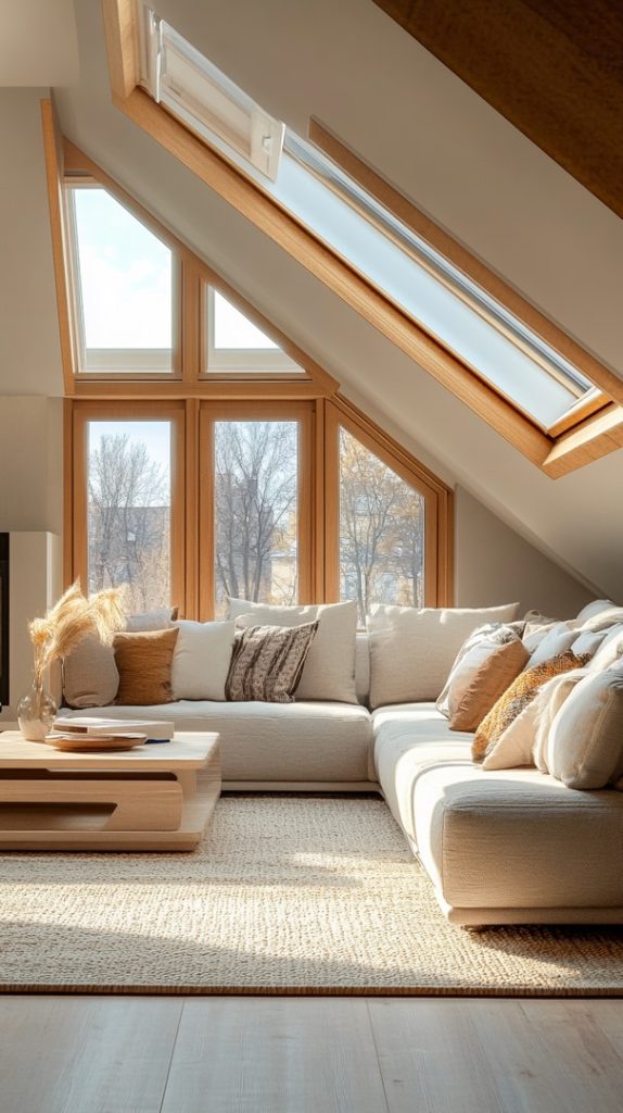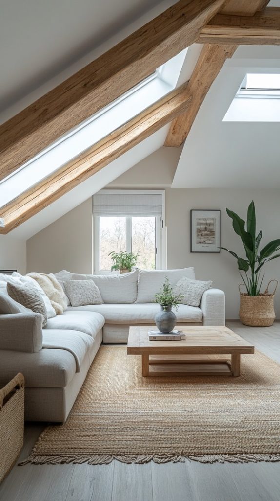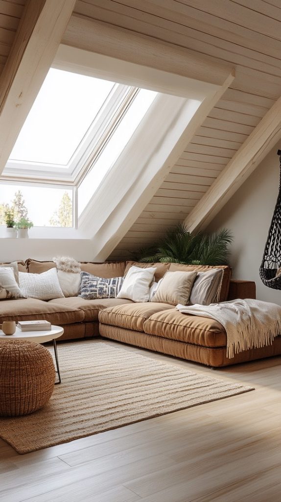 A spacious sectional couch and skylights make this attic living room feel open and light. The neutral tones and natural elements add to the relaxed atmosphere.