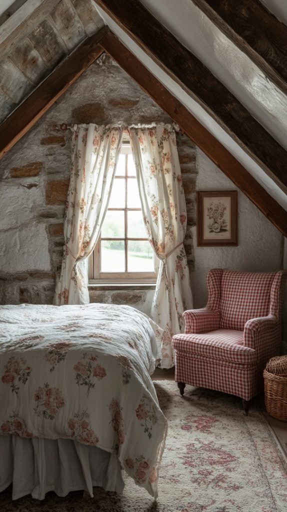 This bright attic space features soft floral patterns and pastel tones, creating a feminine and charming bedroom that’s both cozy and stylish.