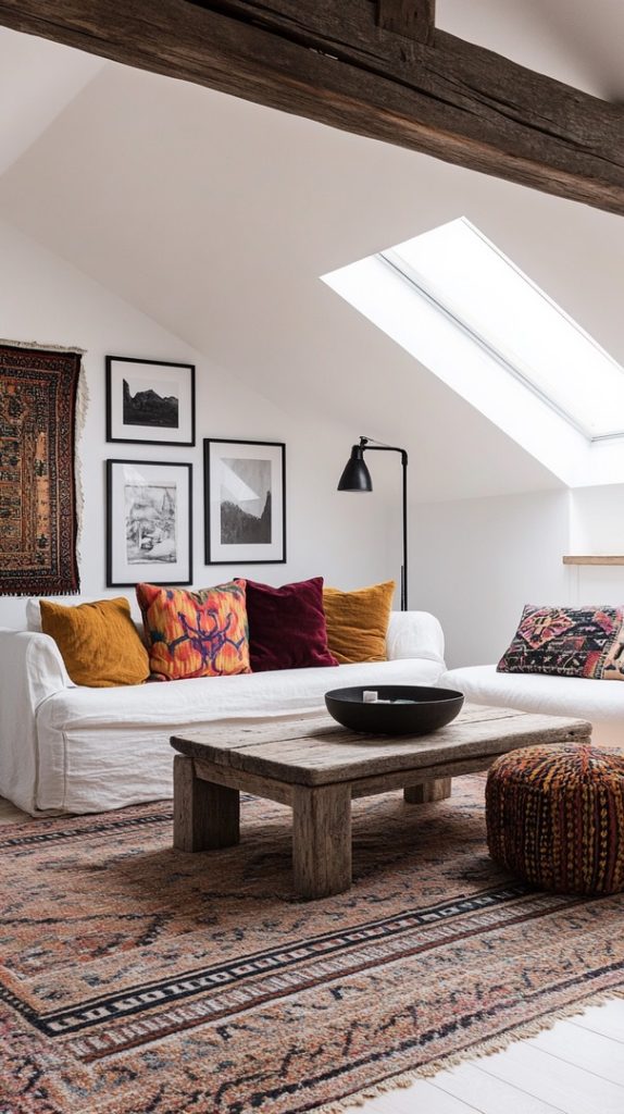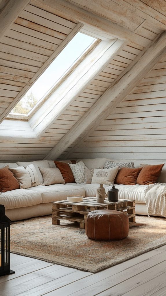 The large skylight and soft furnishings make this attic living room feel incredibly light and open. It’s a cozy space for lounging or entertaining.
