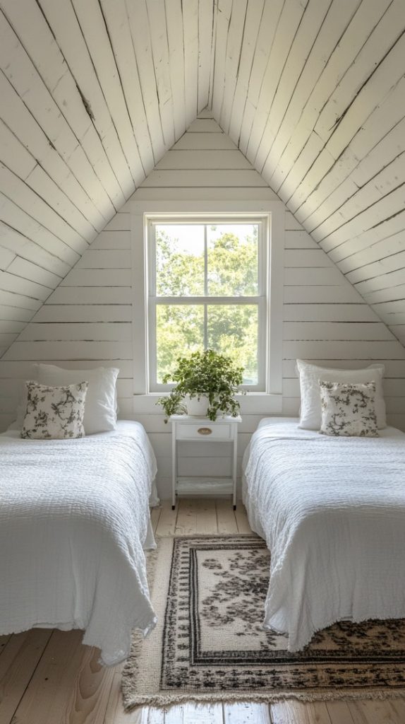 With two matching beds and neutral décor, this attic is transformed into a cozy twin guest room. The simplicity of the design allows the sloped ceiling to stand out.