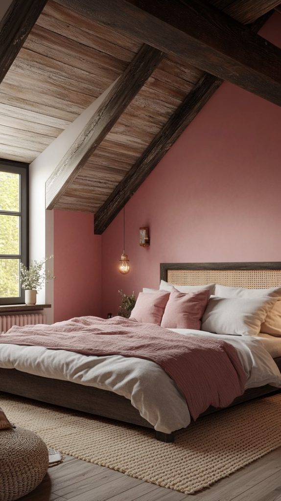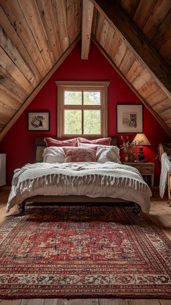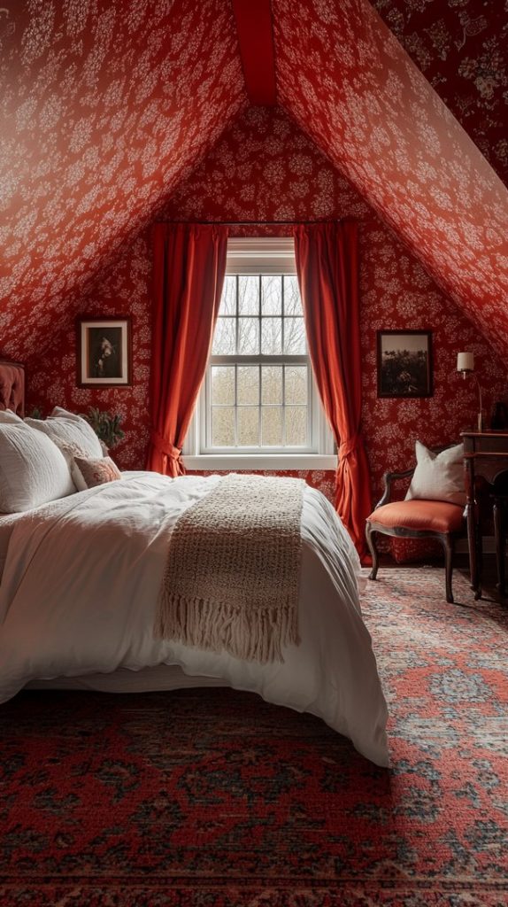 This attic bedroom uses bold red tones to add warmth and character. The combination of plush bedding and natural light creates a cozy and inviting space.