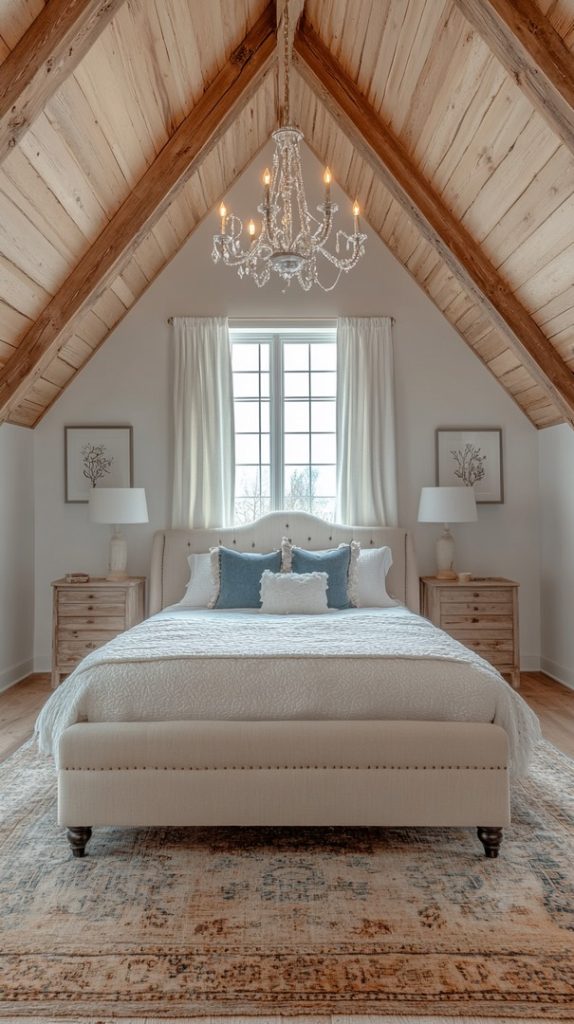 A luxurious chandelier and soft bedding give this attic bedroom a touch of elegance. The light colors and natural light make it feel bright and airy.