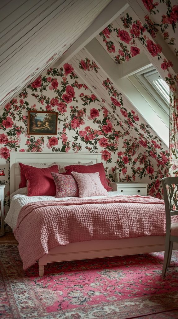 Floral wallpaper and vintage furnishings give this attic bedroom a sweet, feminine charm. The combination of soft colors and cozy textures creates a romantic atmosphere.