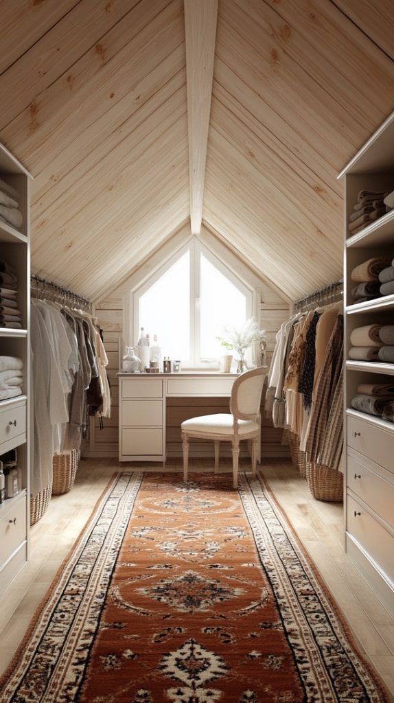 This attic has been transformed into a stylish walk-in closet. The combination of neutral tones and sleek design makes it an organized and luxurious space for storage.
