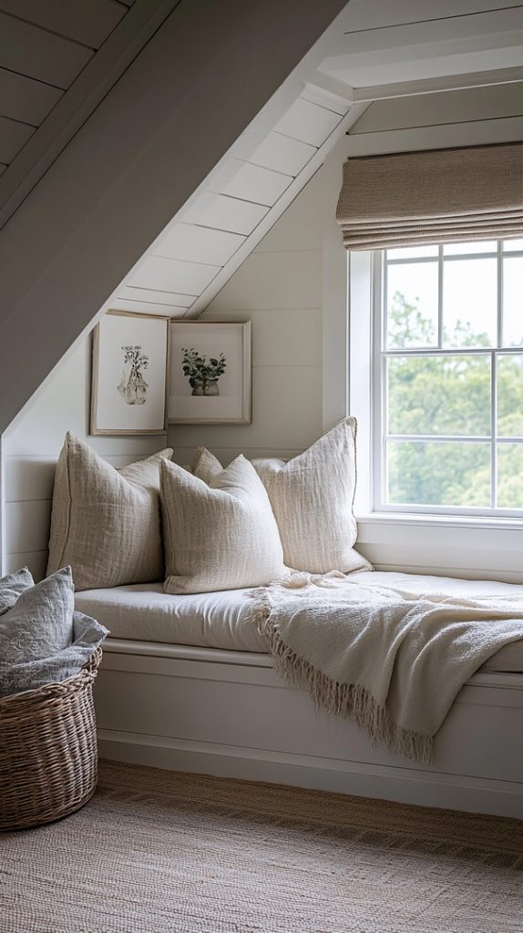 A stunning feature of this room is the cozy window seat that offers a perfect place for reading or enjoying the view. The simple décor and natural light enhance the relaxing vibe.