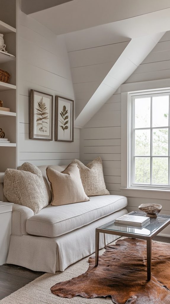 With a white and beige palette, this attic space feels open and organized. A small couch and bookshelves make it ideal for a quiet living area or study spot.