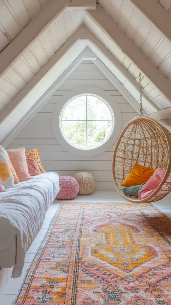 The circular window and eclectic décor give this attic a bohemian charm. A mix of textures and patterns create an inviting and creative environment.