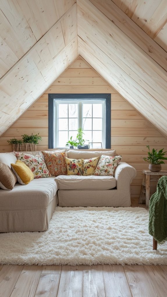 The combination of warm lighting, soft fabrics, and wood elements makes this attic space feel incredibly welcoming. Perfect for relaxing after a long day.