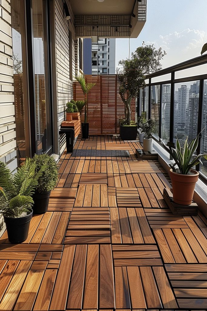 Revamp your balcony’s look by replacing or covering old flooring. Wooden interlocking deck tiles or outdoor rugs can add warmth and style.