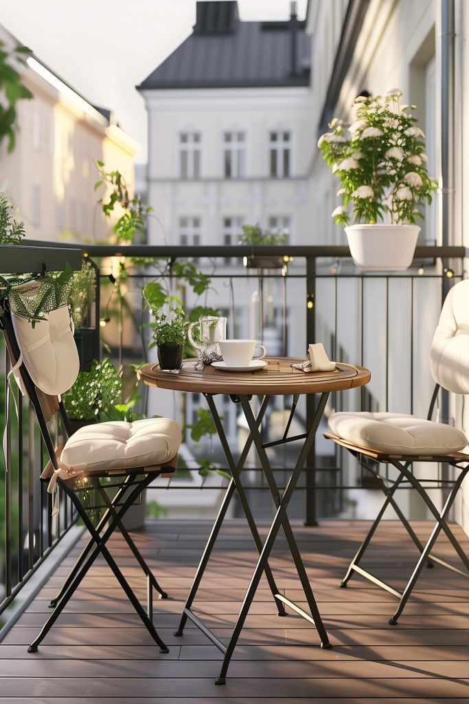 Add a small bistro set, which is perfect for enjoying coffee or meals outdoors, especially in limited spaces.