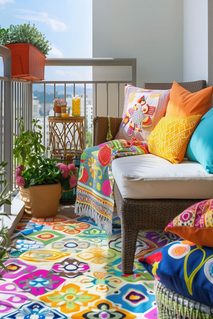 Refresh your balcony with a bold color scheme. Brightly colored cushions, rugs, and decorative accents can bring vibrancy to the space.