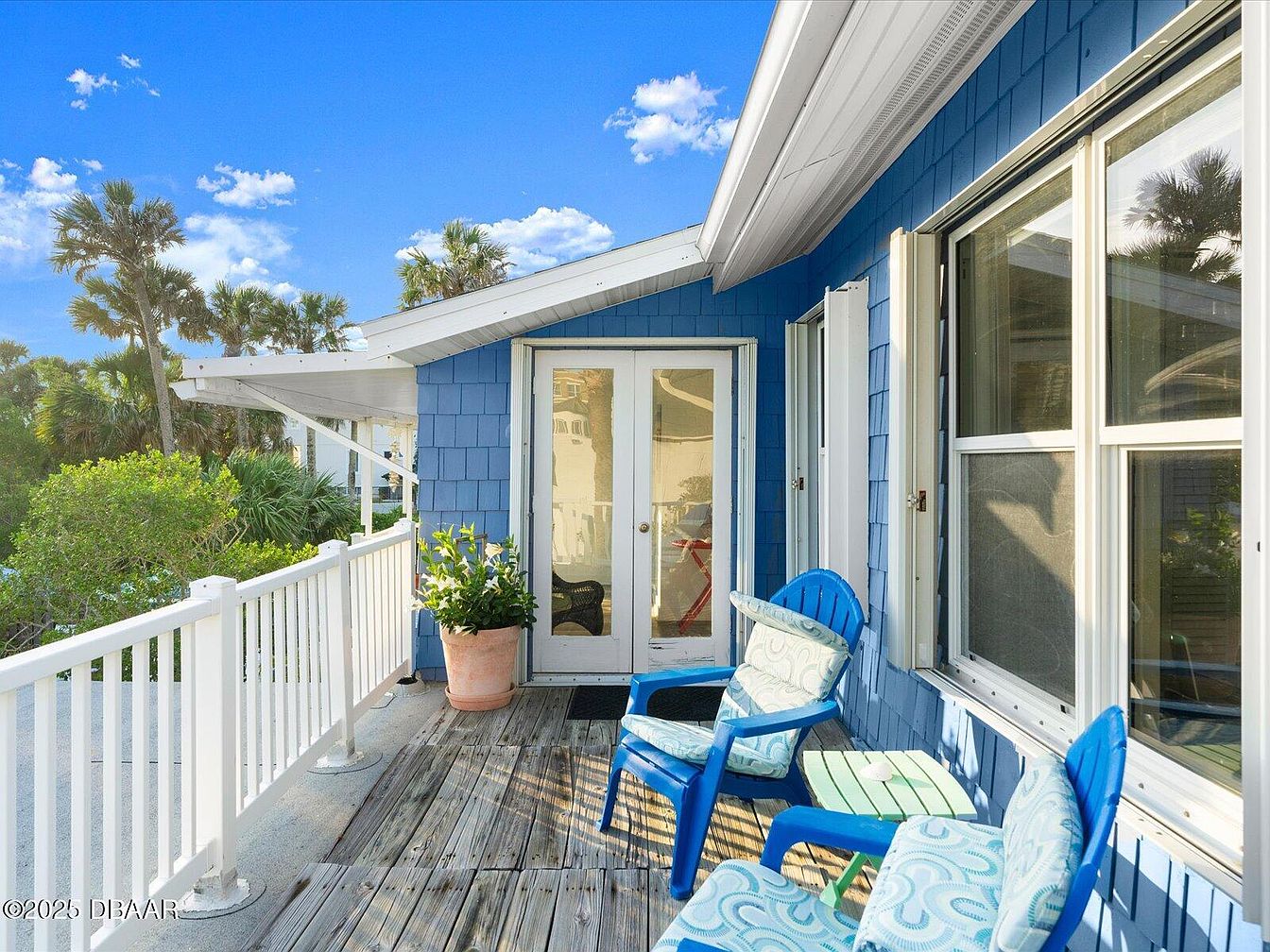 This inviting balcony is located on the second floor and features weathered wooden flooring that adds rustic charm. The exterior walls are covered in classic blue siding with white trim around the windows and French doors, creating a crisp coastal palette. Two comfortable blue Adirondack chairs with patterned cushions flank a small mint-green side table, offering a cozy spot for relaxation. A large terracotta pot with lush greenery complements the vibrant, sunny ambiance. The white railing frames the space, while palm trees and a clear blue sky in the background enhance the serene, beach-inspired vibe.