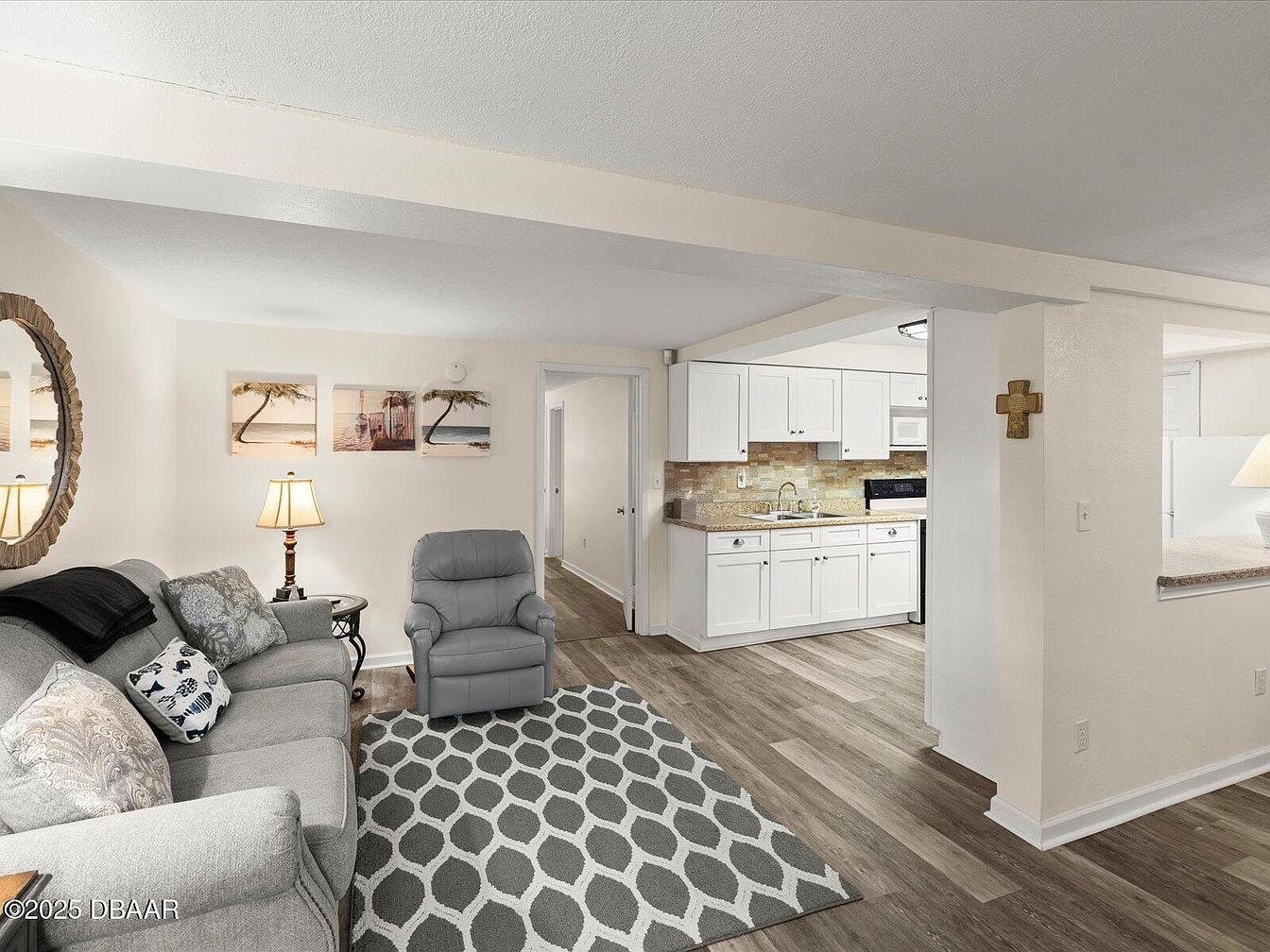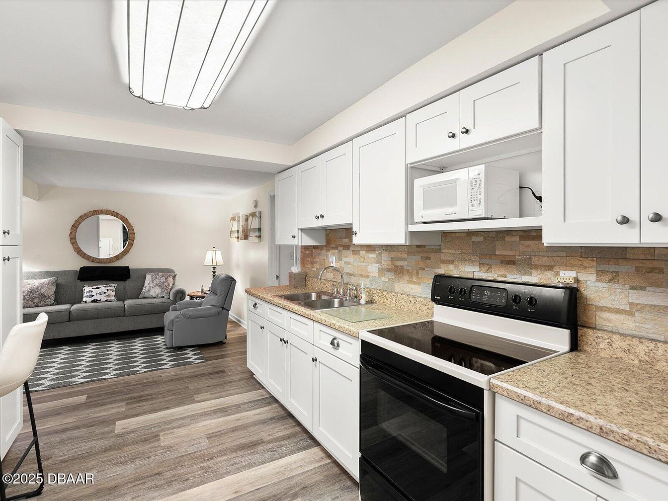 This space features an open kitchen extending into a cozy living nook. The kitchen cabinets are bright white with simple, classic hardware, paired with warm beige granite countertops and a textured stone tile backsplash in earth tones. A black electric stove contrasts sharply with the lighter surfaces, adding visual depth. The flooring is a durable wood-look laminate in varied grayish-brown tones, unifying the kitchen and living areas. The living nook includes a dark gray sofa and a comfortable recliner, complemented by a black and white geometric rug. Soft lighting and neutral wall colors create a calm, inviting atmosphere.