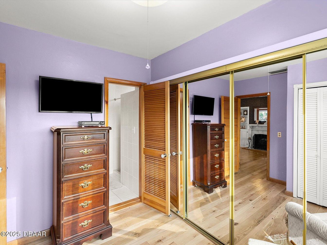 This bedroom corner features soft lavender walls paired with warm wooden trim and light hardwood floors that add warmth and brightness to the space. A tall, dark wooden chest of drawers with brass hardware adds classic elegance and contrasts nicely against the walls. Above the dresser, a flat-screen TV is mounted, creating a convenient entertainment area. Sliding closet doors with gold-tone frames and mirrored panels reflect the room, enhancing the sense of space and light while doubling storage access. An open louvered door reveals a white-tiled bathroom, contributing to the room’s cozy yet functional design.