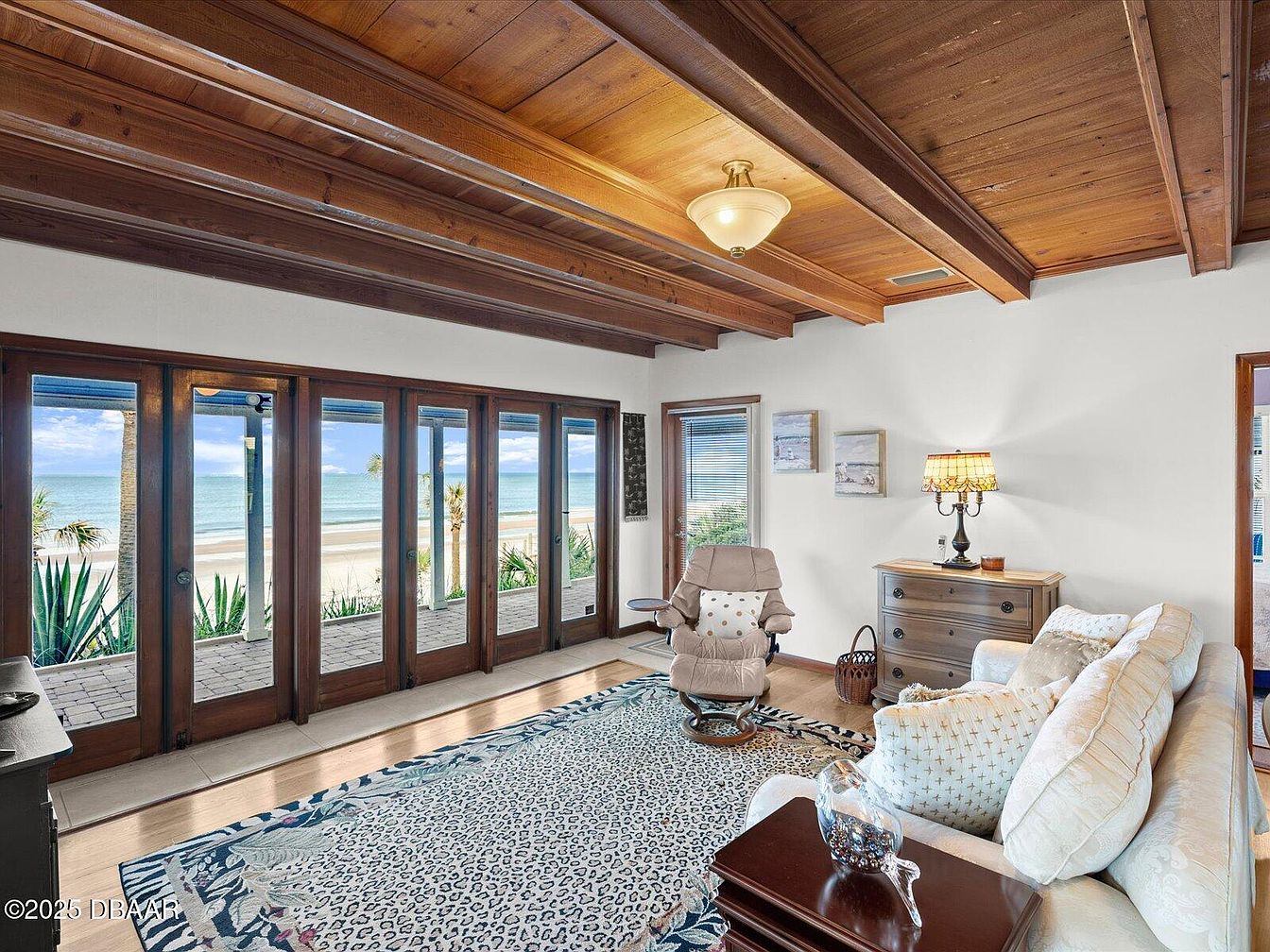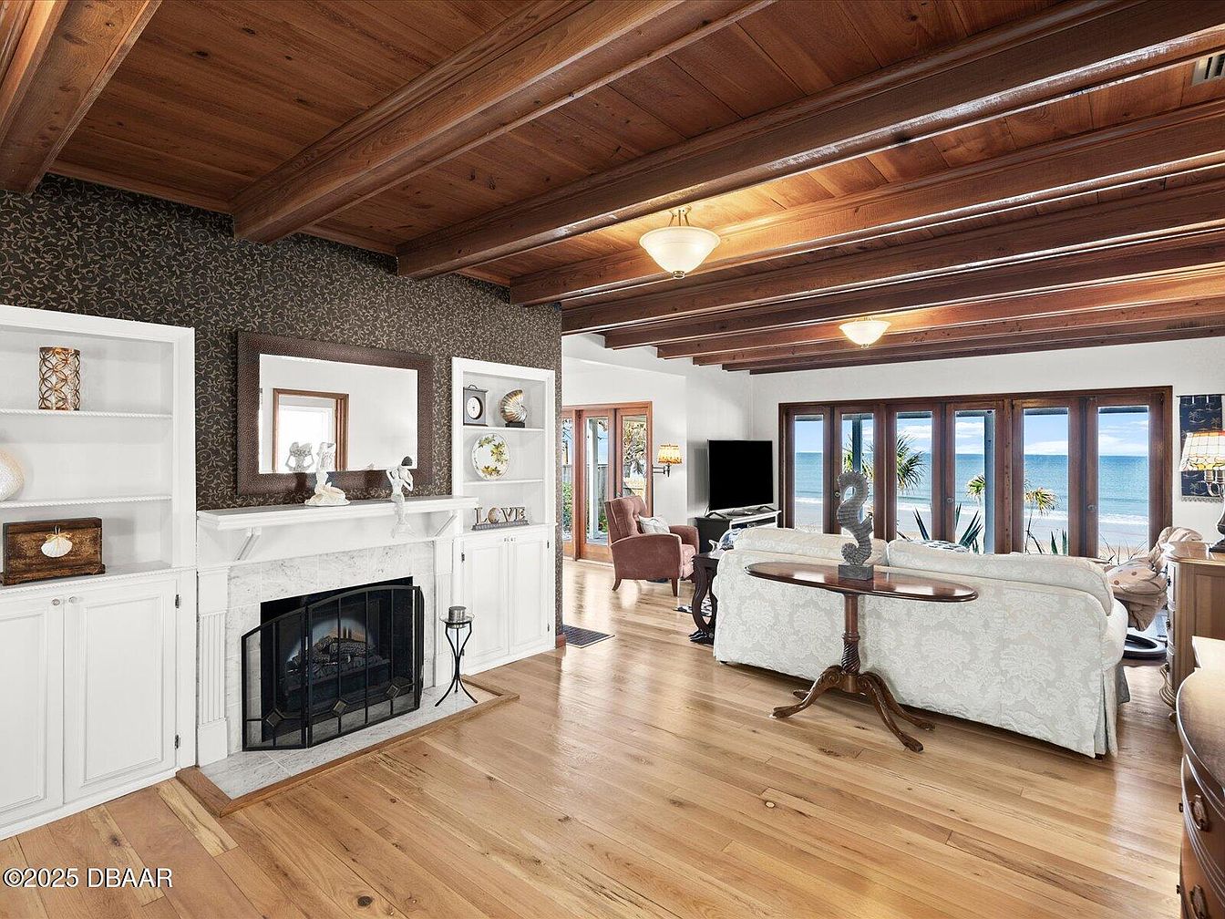 This spacious living room features a warm wooden plank floor and a ceiling made of exposed wood beams that enhance its coastal cottage charm. A white stone fireplace with built-in cabinetry on either side anchors the space, complemented by a dark patterned accent wall behind it. Large sliding glass doors framed in rich wood open to a stunning ocean view, flooding the room with natural light. The furniture includes a delicate floral-patterned sofa and a wood accent table, balancing comfort with classic style. Soft lighting fixtures overhead add finish touches to this inviting, scenic retreat.