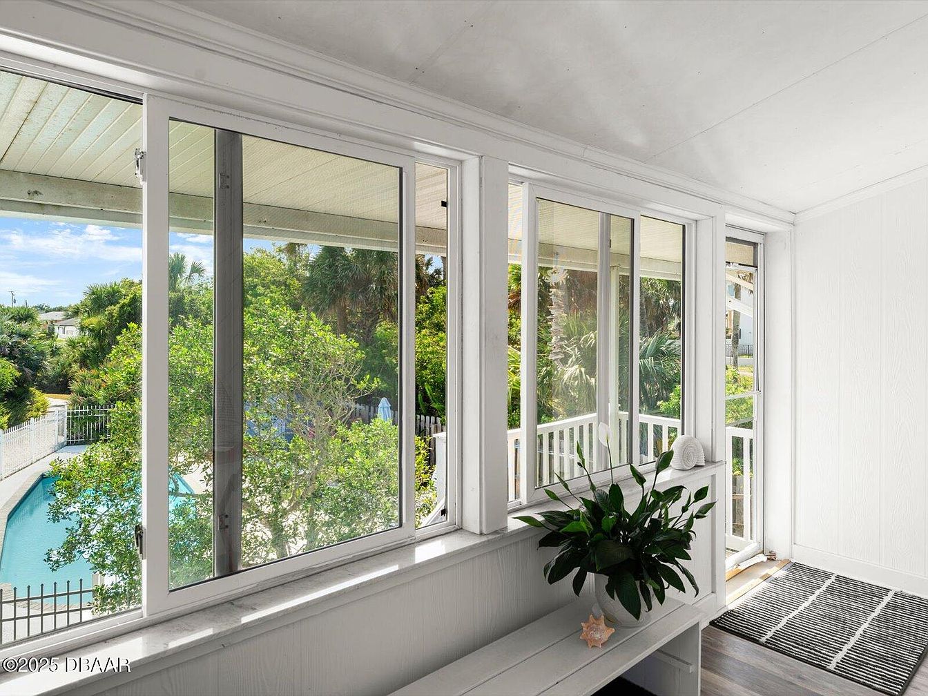 This sunroom features large sliding windows that frame a vibrant outdoor pool area surrounded by lush greenery. The walls are painted crisp white, creating a bright, airy atmosphere that reflects natural light throughout the space. A simple built-in bench in white sits beneath the windows, adorned with a leafy green plant and a seashell decor piece that adds a coastal touch. The dark wood floor contrasts nicely with the white walls and ceiling, while a striped black and white rug adds texture near the entrance door leading to the patio. The room invites relaxation and connection with the outdoors.
