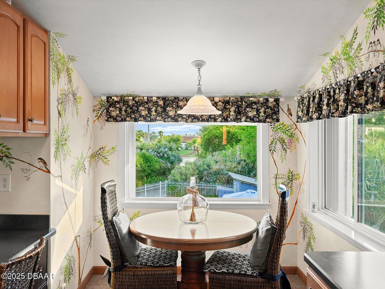This cozy breakfast nook features a round wood table with two wicker chairs upholstered in a black and white patterned fabric, each adorned with a soft gray cushion. The space is enclosed by large windows that flood the area with natural light and provide a lush green outdoor view. The walls are decorated with delicate botanical murals depicting branches, leaves, and small birds, adding a charming touch to the room. Above the windows, black floral valances complement the wallpaper’s nature theme. Warm wooden cabinets and dark countertops frame the nook, blending functionality with inviting aesthetics.