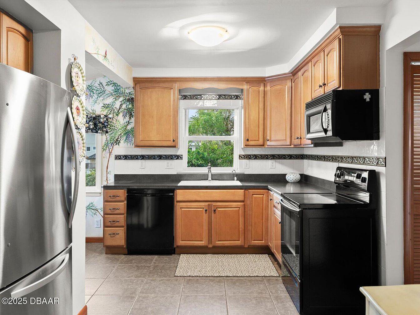 This kitchen features a U-shaped layout with light wood cabinetry providing ample storage space. The black countertops contrast beautifully with the lighter cabinets and tiled floor, which is a medium gray tone. Appliances include a sleek black stove, microwave, and dishwasher, paired with a stainless steel refrigerator that adds a modern metallic touch. Above the sink, a large window brings in natural light and offers greenery views, enhancing the space’s airy feel. The white walls and tiled backsplash incorporate a decorative black and gray tile trim, subtly elevating the traditional design with a touch of intricate detailing.