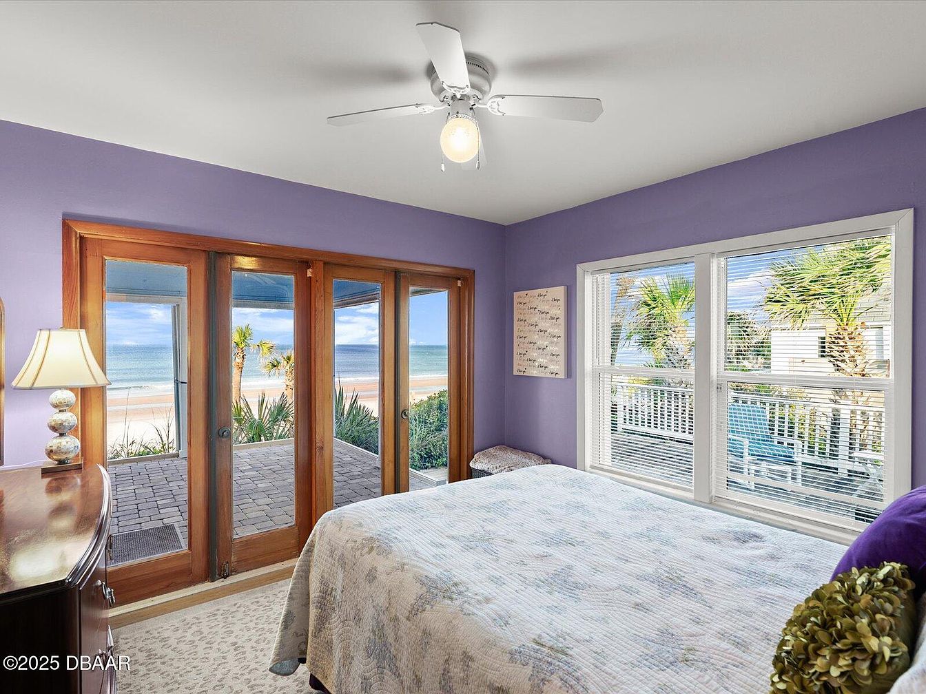 This bedroom offers a serene coastal escape with soothing lavender walls that complement the natural wood trim around expansive glass doors, which open to a patio with an ocean view. The light beige carpet and muted quilted bedding in soft floral patterns create a cozy, inviting atmosphere. A white ceiling fan provides subtle overhead lighting, while a classic lamp on a polished wooden dresser adds warmth and elegance. Floor-to-ceiling windows with white blinds enhance the airy, light-filled space, framing views of palm trees and blue skies, blending indoor comfort with outdoor beauty.