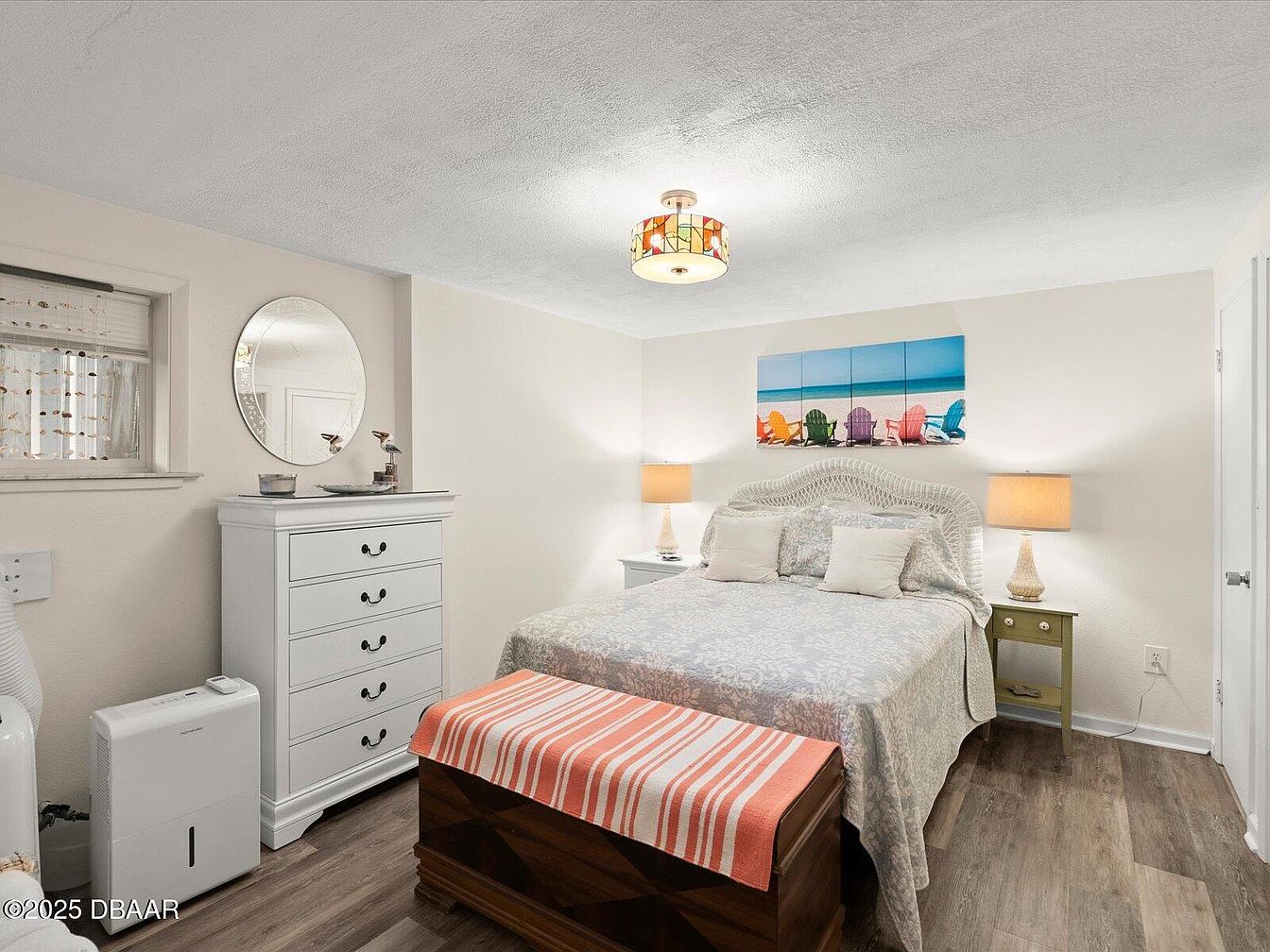 This bedroom features a comfortable queen-sized bed with a soft, patterned quilt in muted tones, complemented by two neutral accent pillows. A woven, white headboard adds a touch of coastal charm, reflected in the beach-themed artwork above that showcases colorful Adirondack chairs facing the sea. On either side of the bed, matching lamps with warm beige shades create a gentle, inviting ambiance. The room’s flooring is a warm wood laminate, paired with light, neutral walls that enhance the cozy and airy feel. A white chest of drawers and a wooden storage bench with a coral-striped cover offer practical storage and subtle color accents. A simple round mirror above the dresser and a stained-glass style ceiling light fixture add character to this peaceful retreat.