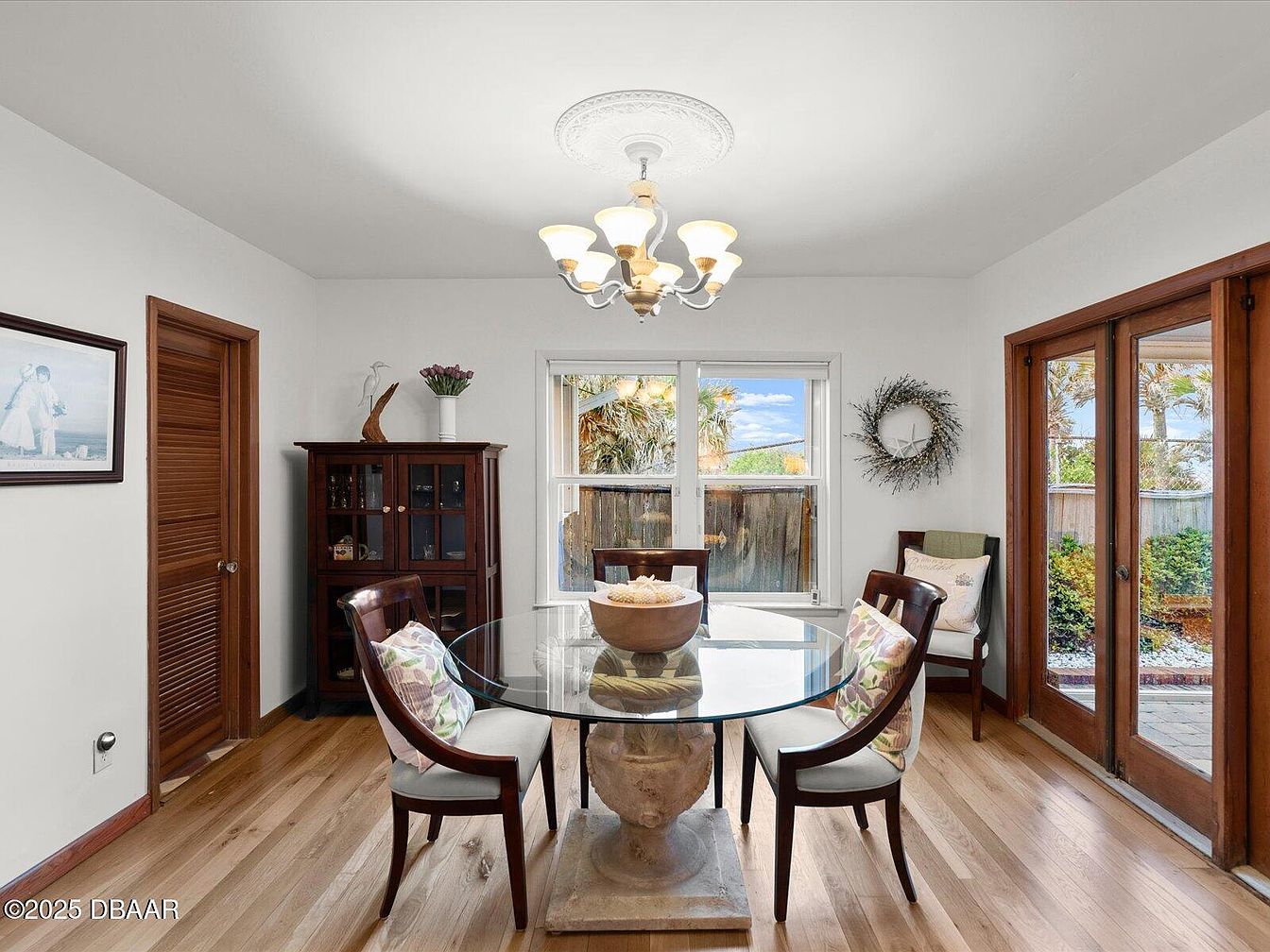 This dining space features a bright, airy layout accentuated by natural wood tones and white walls that create a fresh, clean atmosphere. At the center is a striking round glass table with an ornate stone pedestal base, surrounded by four dark wooden chairs with cream cushions and floral accent pillows, adding subtle color and softness. Large windows and French doors flood the room with natural light while offering views of a fenced garden with greenery. Classic touches include a white decorative ceiling medallion holding a traditional chandelier, a dark wood cabinet for display, and a simple wreath above a corner chair for a cozy, welcoming vibe.