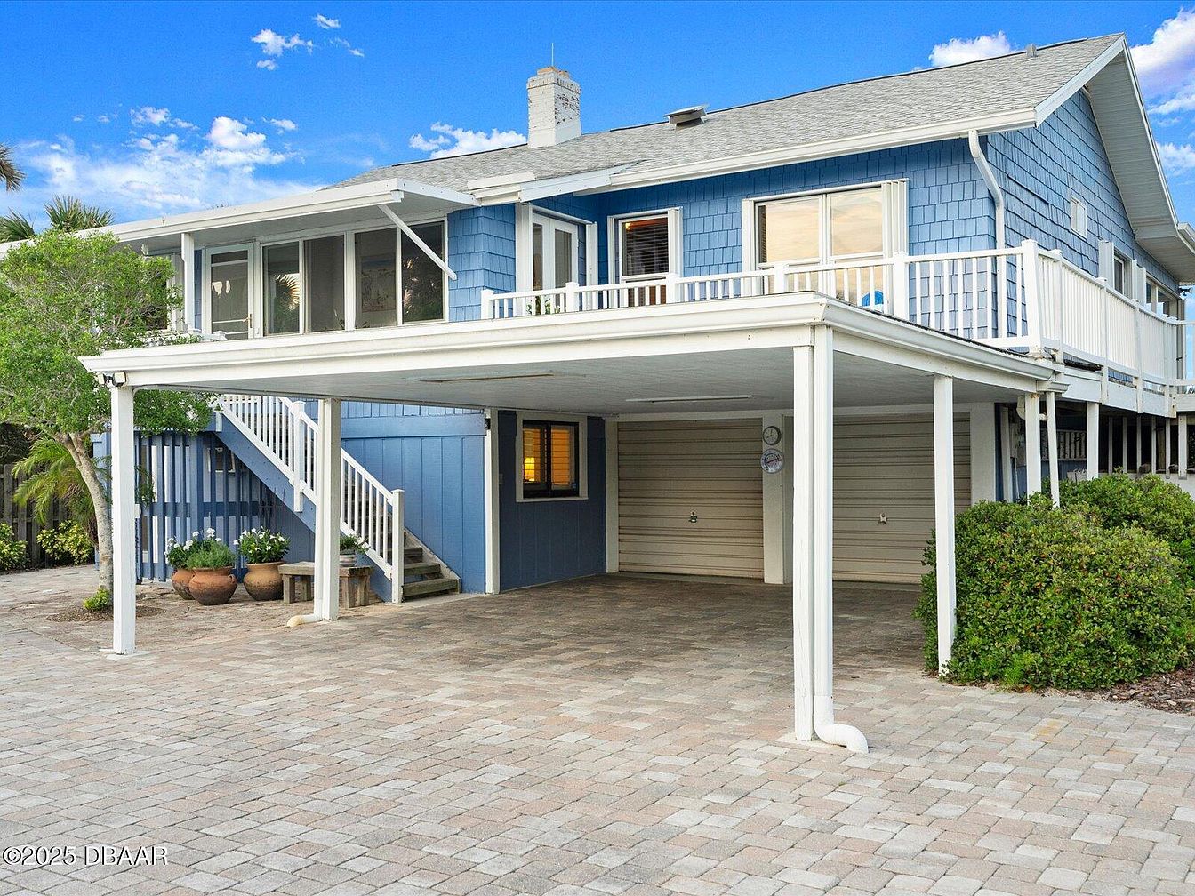 This coastal home features a spacious carport beneath an upper-level balcony, combining practicality with a charming seaside aesthetic. The light blue shingle siding on the upper story contrasts beautifully with the white trim, railings, and support posts, evoking a clean, nautical vibe. The paved driveway and carport floor utilize neutral-toned bricks laid in a herringbone pattern, adding texture and durability. The balcony above is enclosed by white railings, offering a relaxing outdoor space. Exterior stairs connect the carport area to the veranda and living spaces above, surrounded by lush greenery and welcoming terracotta pots filled with plants.