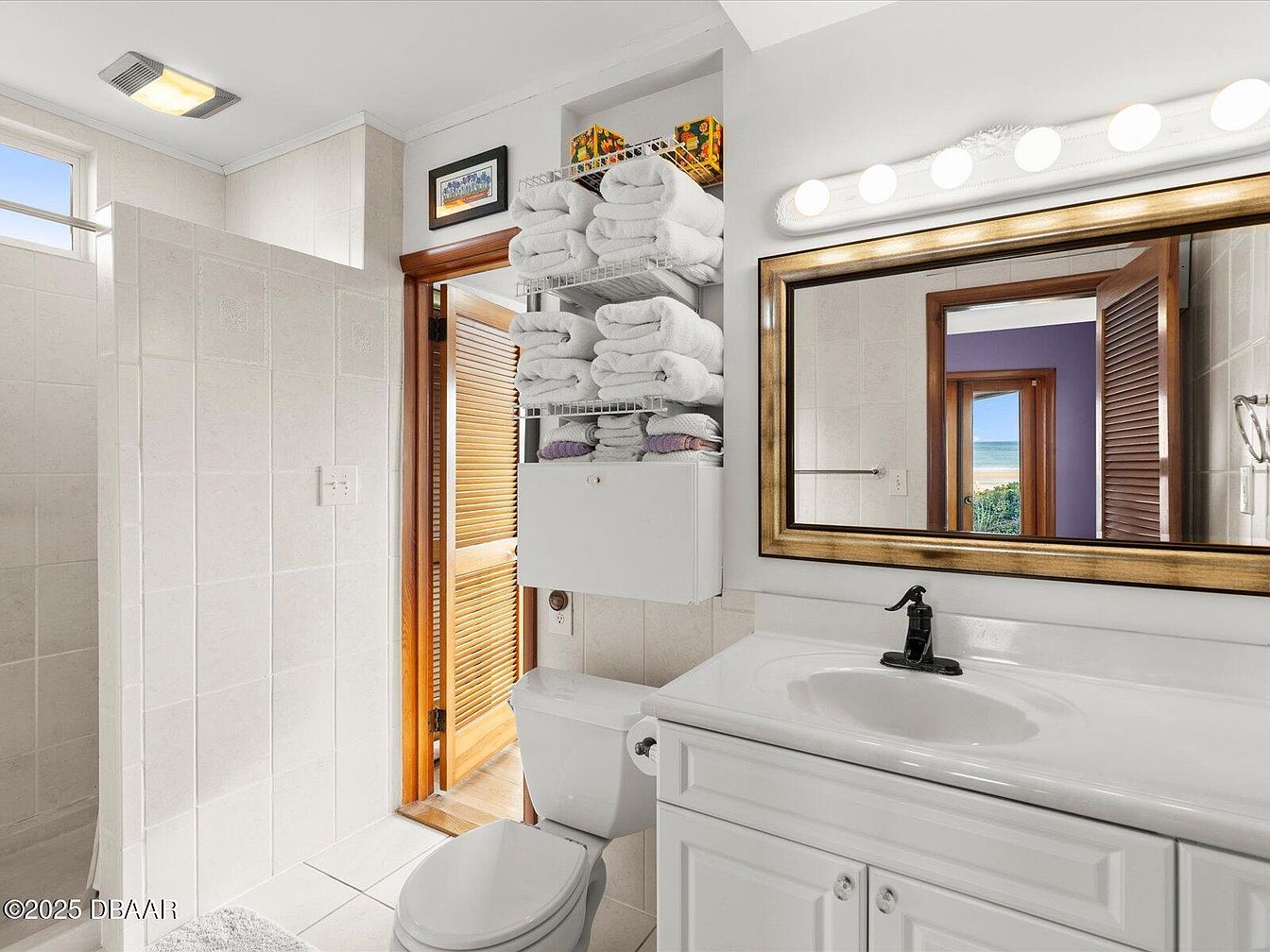 This bathroom features a bright, clean design with white tiles and cabinetry creating a fresh atmosphere. A white vanity offers a smooth countertop and an undermount sink paired with a dark faucet for contrast. Above it hangs a large mirror framed in warm wood tones, flanked by a row of round vanity bulbs for ample lighting. To the left, a wall-mounted storage unit holds neatly folded towels, optimizing vertical space. The natural wooden door with slats leads to an adjoining room painted in purple, visible through the mirror’s reflection, hinting at a coastal theme with a view of the ocean beyond.