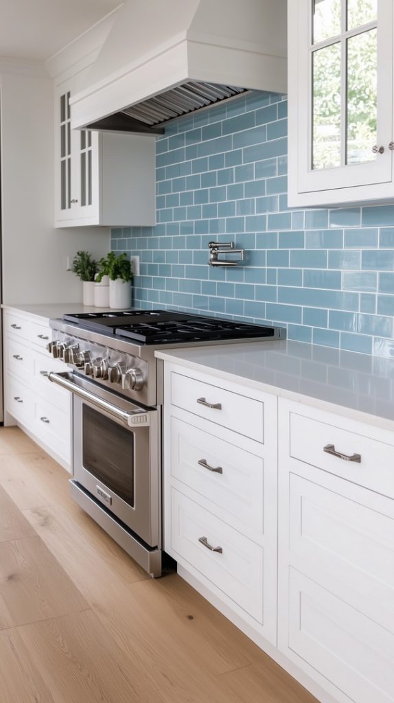 This kitchen embraces a fresh and clean aesthetic with soft light blue subway tiles. The glossy finish of the tiles reflects natural light, making the space feel larger and brighter. Paired with white cabinetry and light wooden flooring, this backsplash creates an airy and tranquil environment. The minimalistic design is ideal for homeowners seeking a calming yet stylish kitchen that retains a classic feel with a modern twist.
