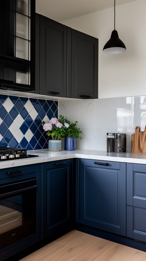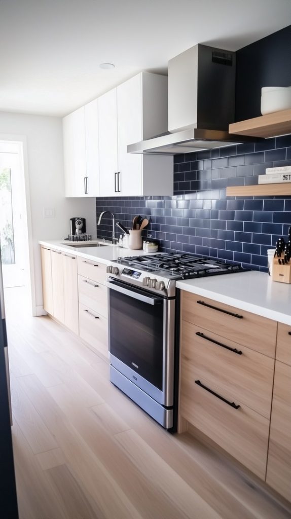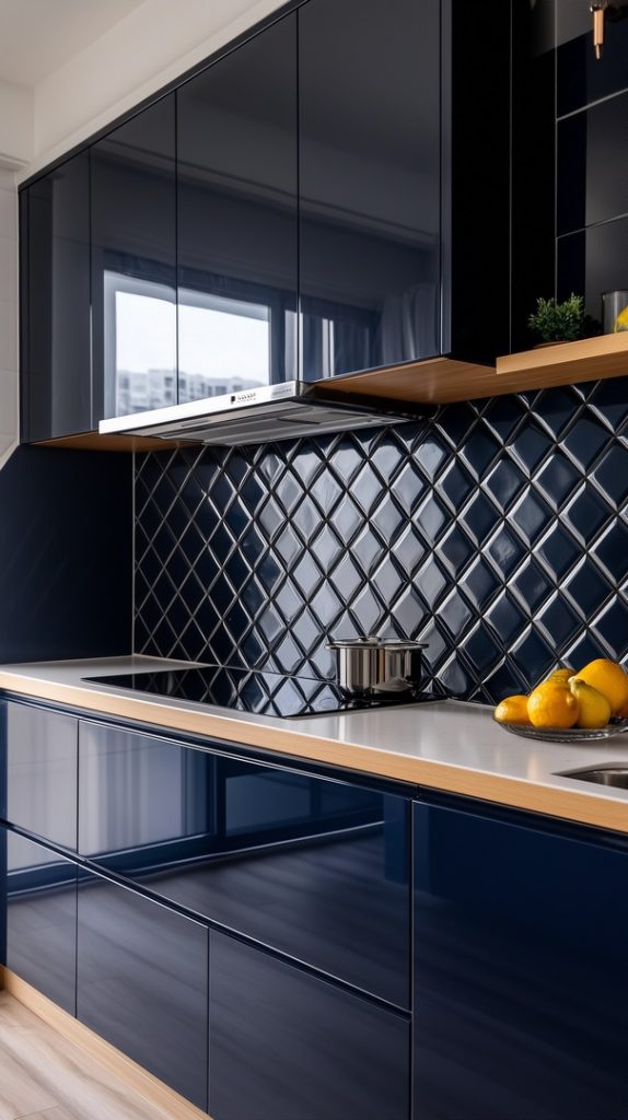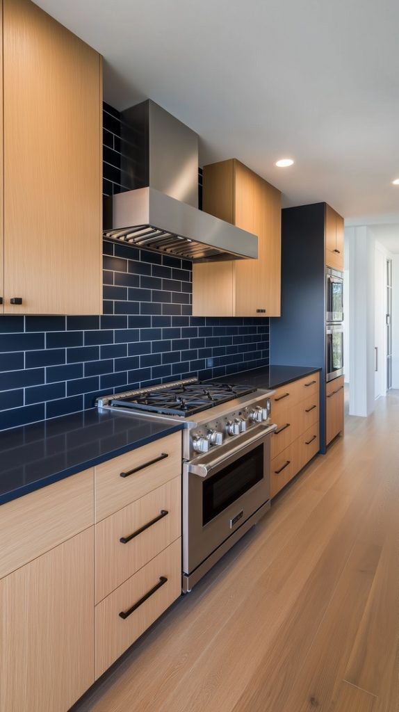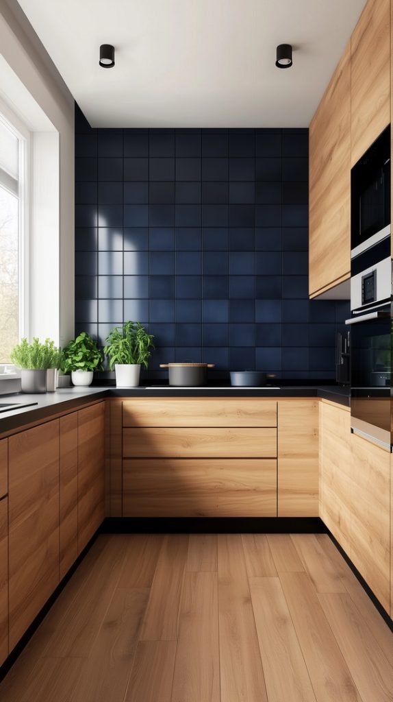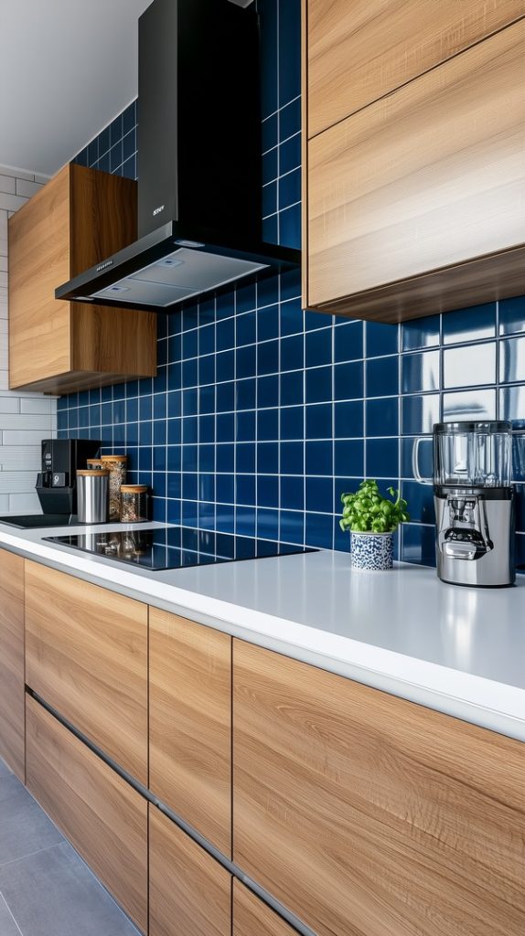 In this compact kitchen, navy blue tiles are used to create a sense of depth and sophistication. The dark blue tiles are paired with light wood cabinets, creating a clean, minimalist aesthetic. The sleek design is perfect for small spaces, adding a touch of elegance without overwhelming the room with too much color or texture.