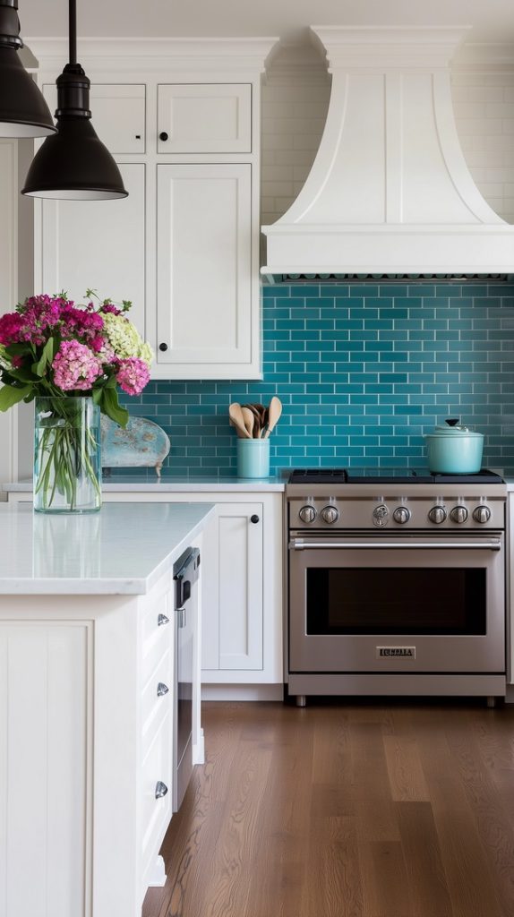 This kitchen’s bright aqua subway tiles bring a refreshing coastal feel to the space. The glossy finish of the tiles reflects the natural light beautifully, making the room feel airy and spacious. White cabinetry and stainless steel appliances complement the bright blue tones, giving the kitchen a crisp, clean look that’s perfect for those who love a seaside-inspired interior.