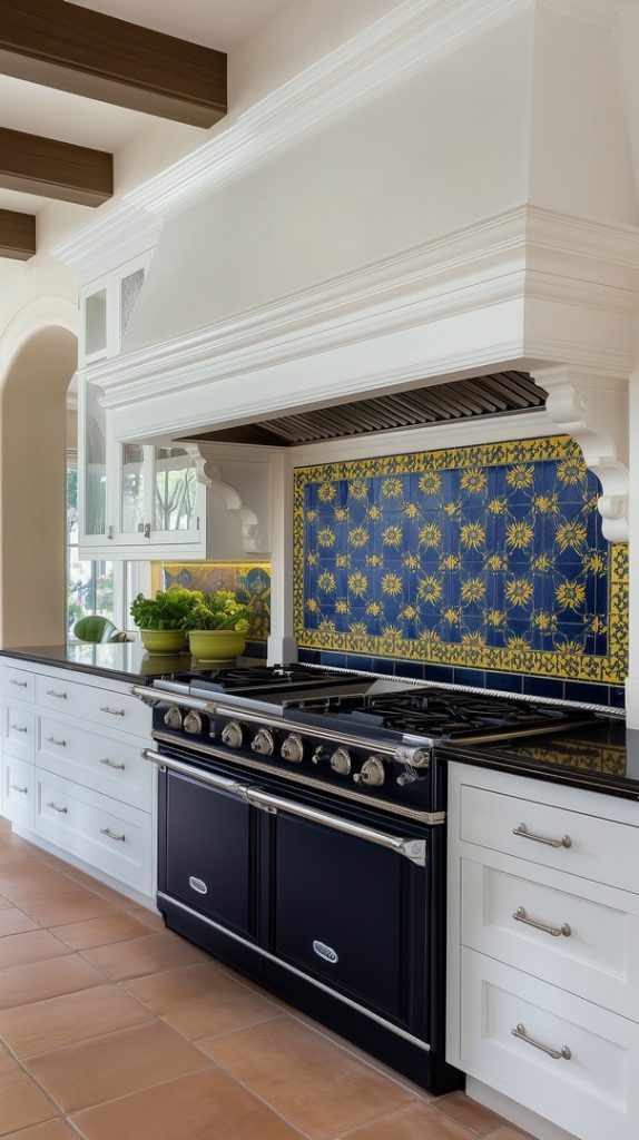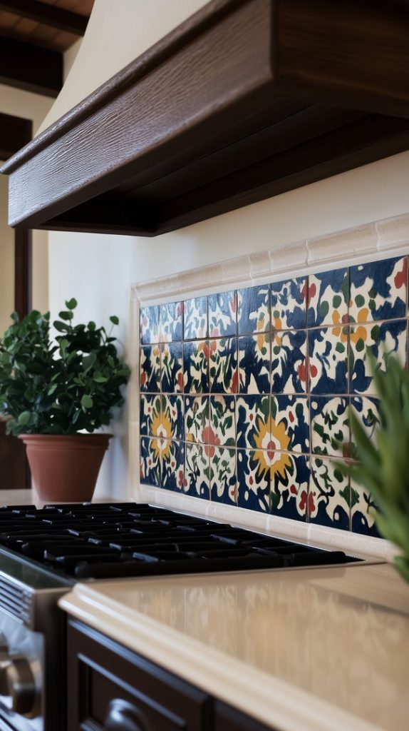 This Mediterranean-inspired kitchen backsplash features bold floral patterns in vibrant colors, set against a deep navy background. The intricate tilework instantly adds character and a splash of charm to your kitchen, making it a standout feature in any cooking space. The combination of bright yellows, reds, and greens creates a lively contrast, evoking the warmth and vibrancy of Mediterranean homes. Paired with dark wood cabinetry and a sleek stove, this backsplash delivers both a rustic and artistic appeal that celebrates craftsmanship and culture.