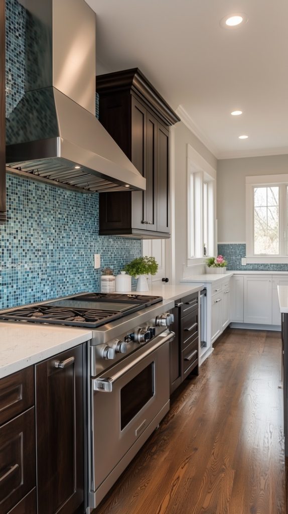 This kitchen embraces vibrant blue mosaic tiles that add an intricate pop of color and texture to the space. Paired with dark wood cabinetry and stainless steel appliances, this backsplash adds depth and energy, making the kitchen feel lively and inviting. The reflective surface of the tiles catches the light, enhancing the brightness of the room, perfect for homeowners looking to add a dynamic focal point to their culinary area.