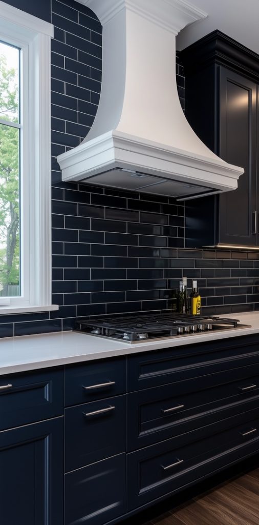 This kitchen features sleek midnight blue subway tiles that exude elegance and sophistication. Paired with dark cabinets and a white hood, the backsplash creates a high-contrast, luxurious atmosphere. The deep blue tones add a bold yet refined aesthetic, ideal for those who want to create a chic and modern space that feels both intimate and stylish.