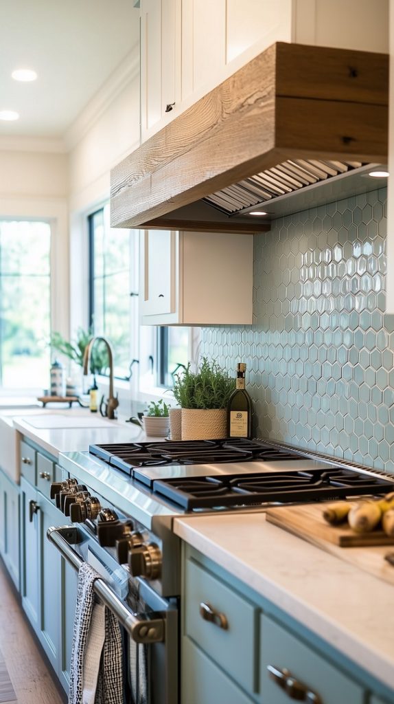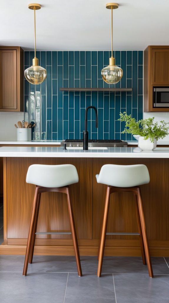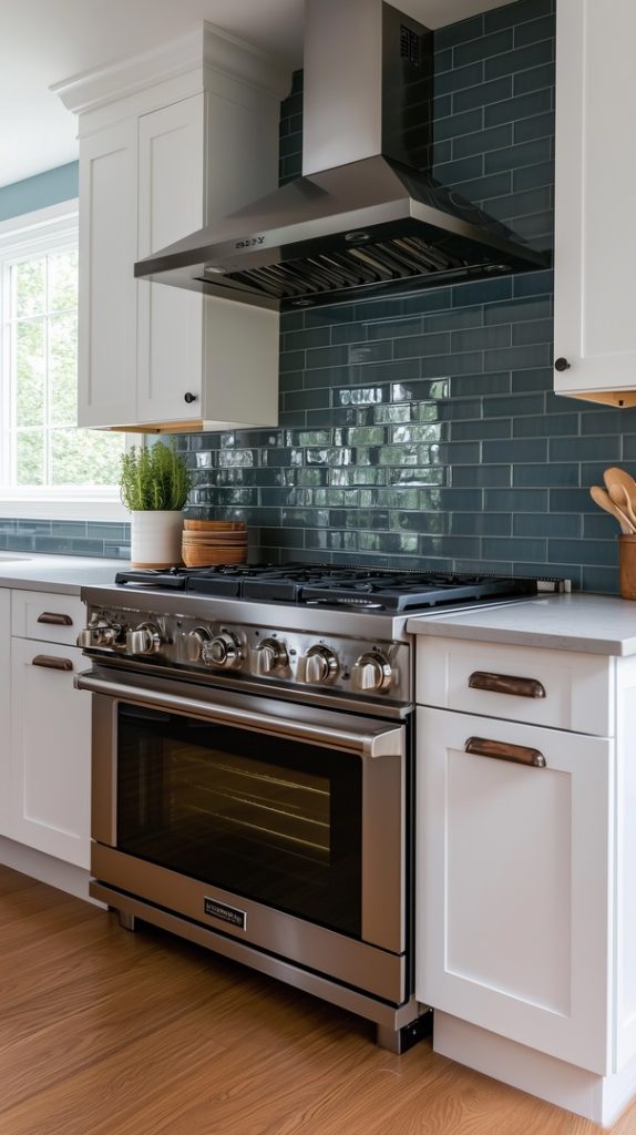 This kitchen pairs glossy teal tiles with natural wood accents for a charming rustic look. The cool blue tones provide a refreshing backdrop, while the wood adds warmth and texture. This backsplash brings a sense of balance and tranquility, making it the perfect design for kitchens aiming for a mix of modern aesthetics and cozy rustic appeal.