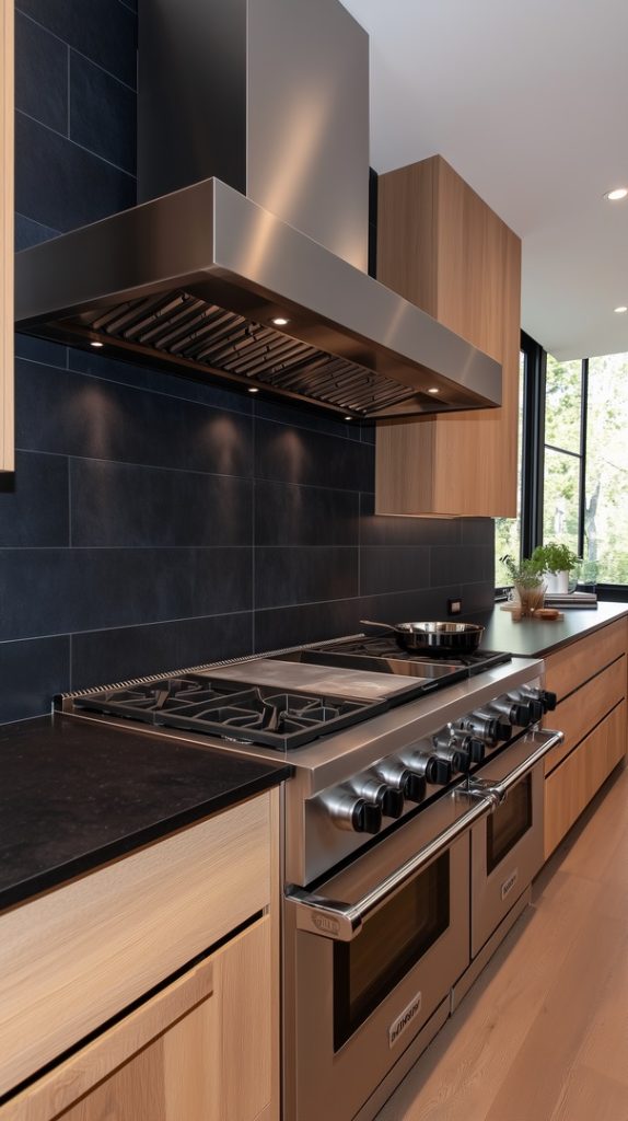 Featuring deep blue brick-style tiles, this kitchen is the epitome of modern design. The tiles, with their matte finish, create a rich, bold backdrop that adds depth and texture to the space. Paired with light wood cabinetry and stainless steel accents, the overall look is contemporary and sleek. This backsplash choice is perfect for kitchens aiming to combine warmth and style in a bold, yet refined way.