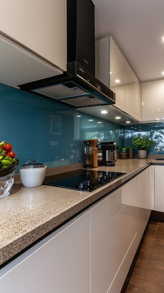 This kitchen uses a glossy blue backsplash to brighten up the space, paired with sleek white cabinetry for a modern, clean aesthetic. The reflective surface adds depth and dimension, making the kitchen feel open and welcoming. This design is ideal for homeowners who want a simple yet eye-catching design that maximizes light and space.