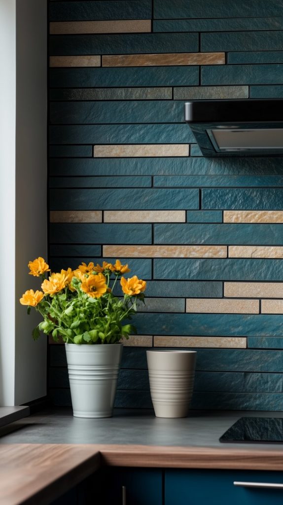 A unique striped design in teal and beige tiles brings a contemporary flair to this kitchen. The vertical orientation of the tiles adds height to the space, making the kitchen feel larger and more open. This backsplash combines cool blue tones with warm beige, creating an inviting and balanced aesthetic. Ideal for those seeking a bold yet harmonious design statement.