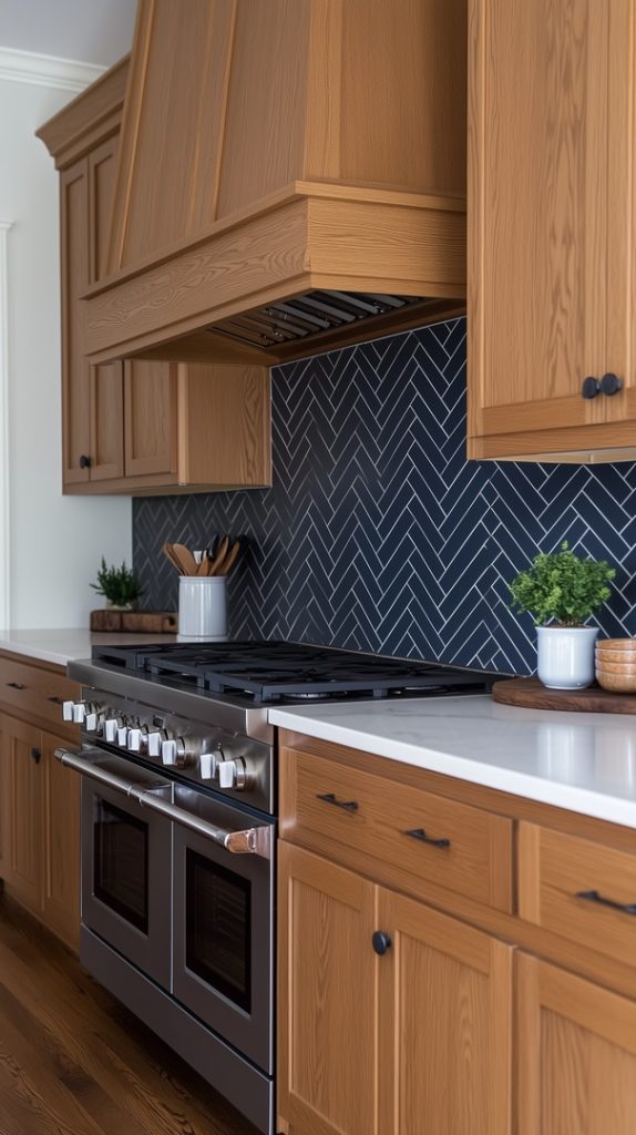 Herringbone Blue Tile Backsplash with Natural Wood Cabinets