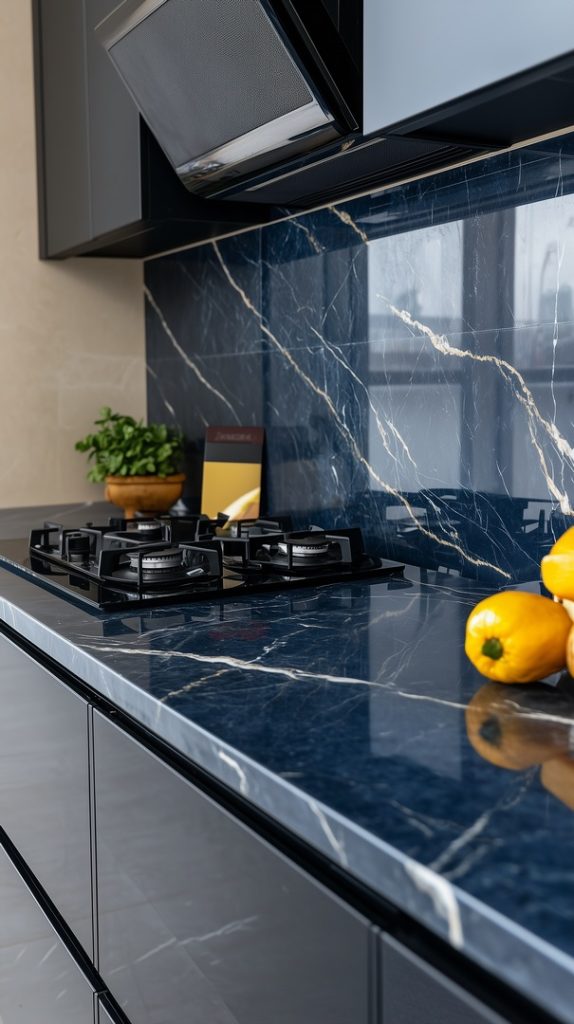 A deep blue, marble-like backsplash adds luxury and sophistication to this kitchen design. The rich tones complement the white countertops and cabinetry, creating a striking contrast that enhances the kitchen’s overall look. Perfect for homeowners who want to bring a high-end feel to their culinary space while incorporating classic materials.