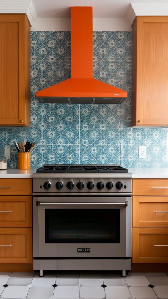 For a kitchen that dares to be bold, this retro turquoise blue backsplash adds a playful, energetic vibe. Paired with bright orange hood accents and natural wood cabinets, the design merges modern style with vintage flair. The intricate tile patterns are eye-catching and fun, making this backsplash perfect for those who love color and quirky design elements in their home.