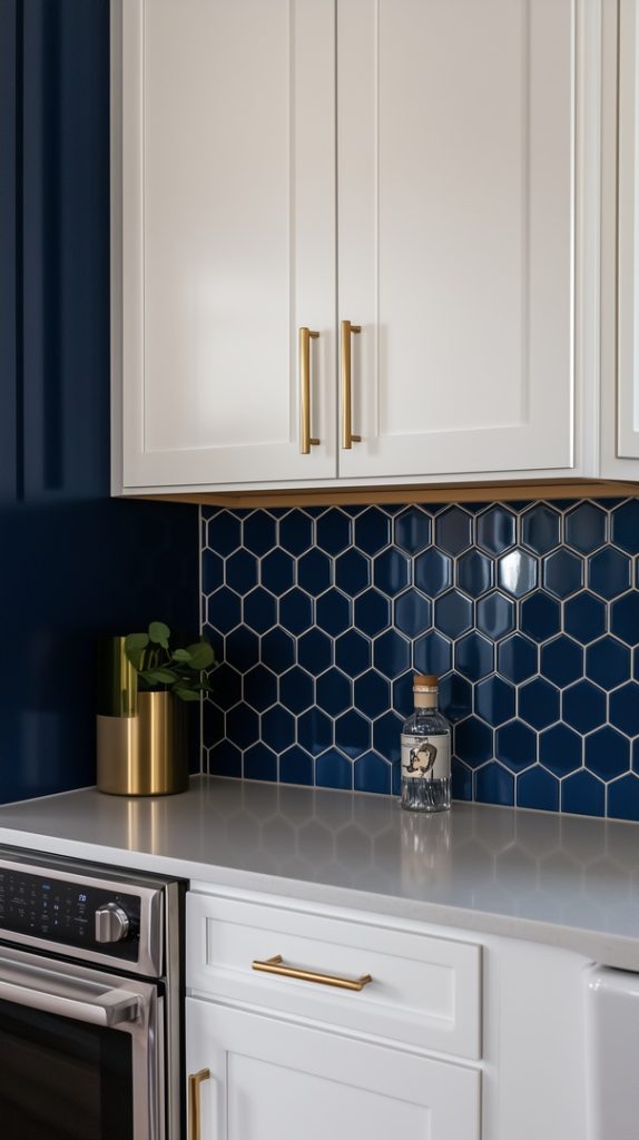Bold navy blue hexagon tiles make a striking statement in this kitchen. Paired with white countertops and cabinetry, the backsplash adds a strong contrast that emphasizes the kitchen’s clean lines and modern aesthetic. The geometric design introduces a fun and stylish element to the space, making it a great choice for those who enjoy playful yet sophisticated design.