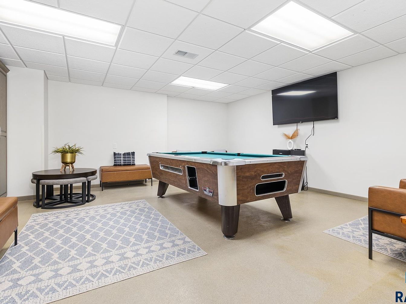 This spacious game room features a classic pool table as the focal point, surrounded by a cozy seating arrangement. Two stylish brown leather chairs complement the modern aesthetic. A large flat-screen TV is mounted on the wall, ideal for family entertainment. The neutral color palette includes light walls and a soft beige floor, enhancing the room’s brightness. A textured area rug in muted blue adds warmth beneath the coffee table, which has a sleek black base. A touch of greenery from a potted plant provides a refreshing accent, making this space both inviting and perfect for family gatherings.