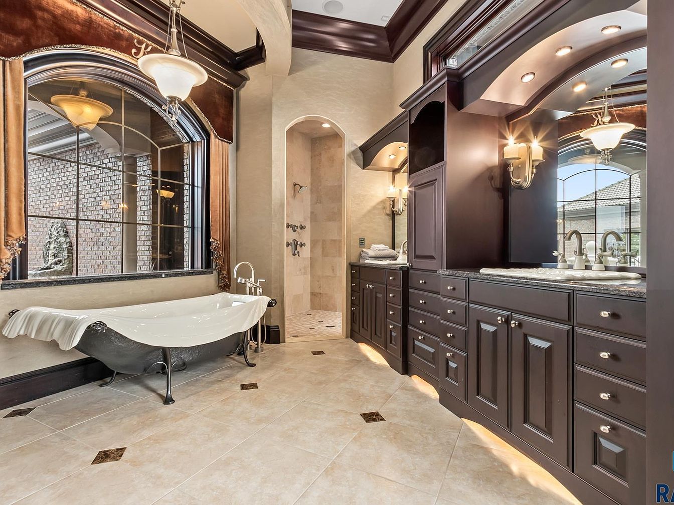 This lavish bathroom features an elegant clawfoot tub, positioned to enjoy the natural light streaming through large windows adorned with rich, chocolate-brown drapes. The dual vanities, crafted in dark wood, add a touch of sophistication alongside a stunning granite countertop. Natural stone tiles grace the shower area and floor, enhancing the overall luxury. Soft, ambient lighting is provided by sconces and a pendant fixture, creating a warm atmosphere. The seamless blend of classic and contemporary design elements makes this space inviting, offering family-friendly amenities such as ample storage and a spacious layout for comfortable use.