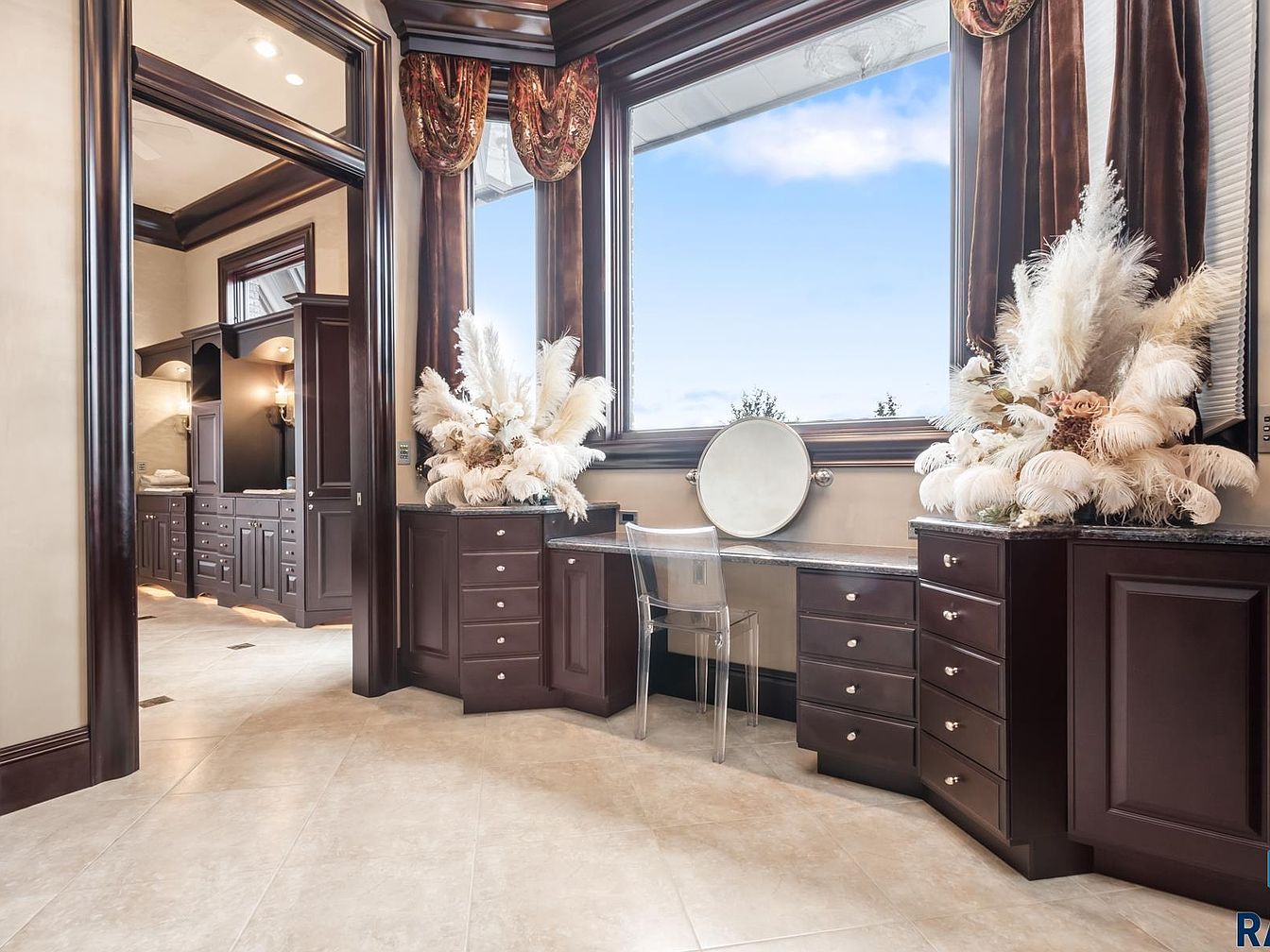 This elegant bathroom vanity area features rich dark wood cabinetry, complemented by sleek granite countertops and polished chrome fixtures. A spacious layout offers ample storage with numerous drawers and a mirrored wall that enhances natural light. The room balances luxury and practicality, perfect for family use. Soft, neutral tones in the tiled flooring add warmth to the space, while large windows adorned with stylish drapes provide scenic views and brightness. Decorative elements, including a chic round mirror and plush floral arrangements, contribute to the inviting atmosphere, making it a serene retreat for all family members.
