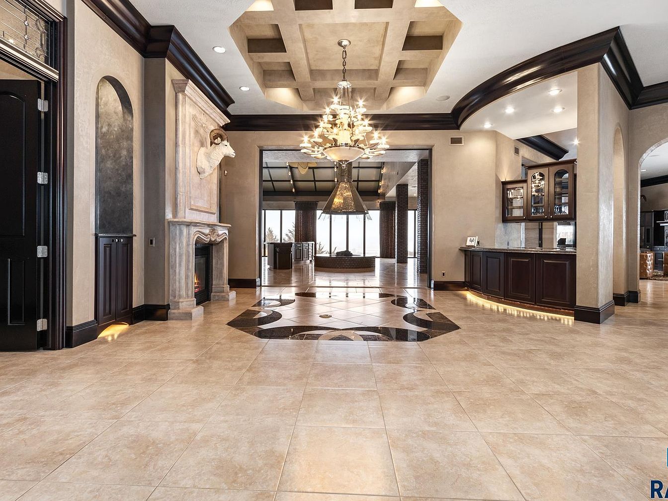 The entrance hallway features an expansive layout with elegant architectural details. Rich, dark wood accents trim the coffered ceiling and doorway, providing a warm contrast against the light-colored walls. A striking stone fireplace, topped with an ornamental animal head, serves as a focal point. The high-quality tile floor has intricate patterns, enhancing the sophistication of the space. A modern chandelier casts soft lighting, creating an inviting ambiance. An alcove on the left offers additional storage, while a built-in bar with glass cabinetry stands on the right. This layout is family-friendly, promoting a seamless flow for gatherings.